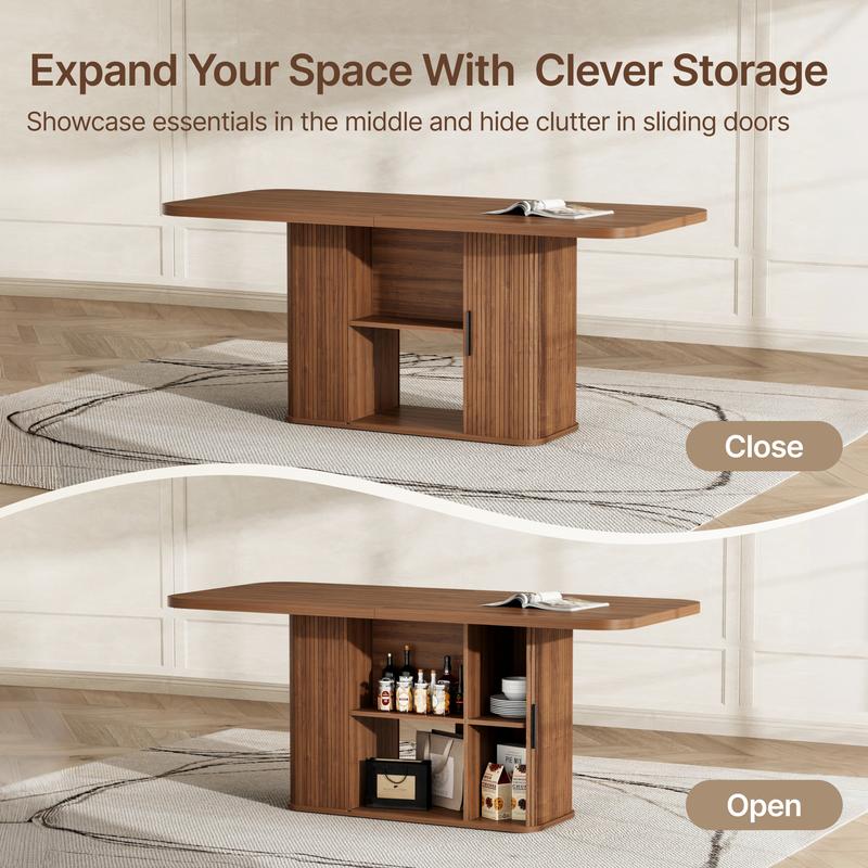 The thoughtfully designed base includes an open shelf and sliding tambour doors, providing convenient hidden storage for dinnerware, table linens, or kitchen essentials while keeping your dining area organized and clutter-free.