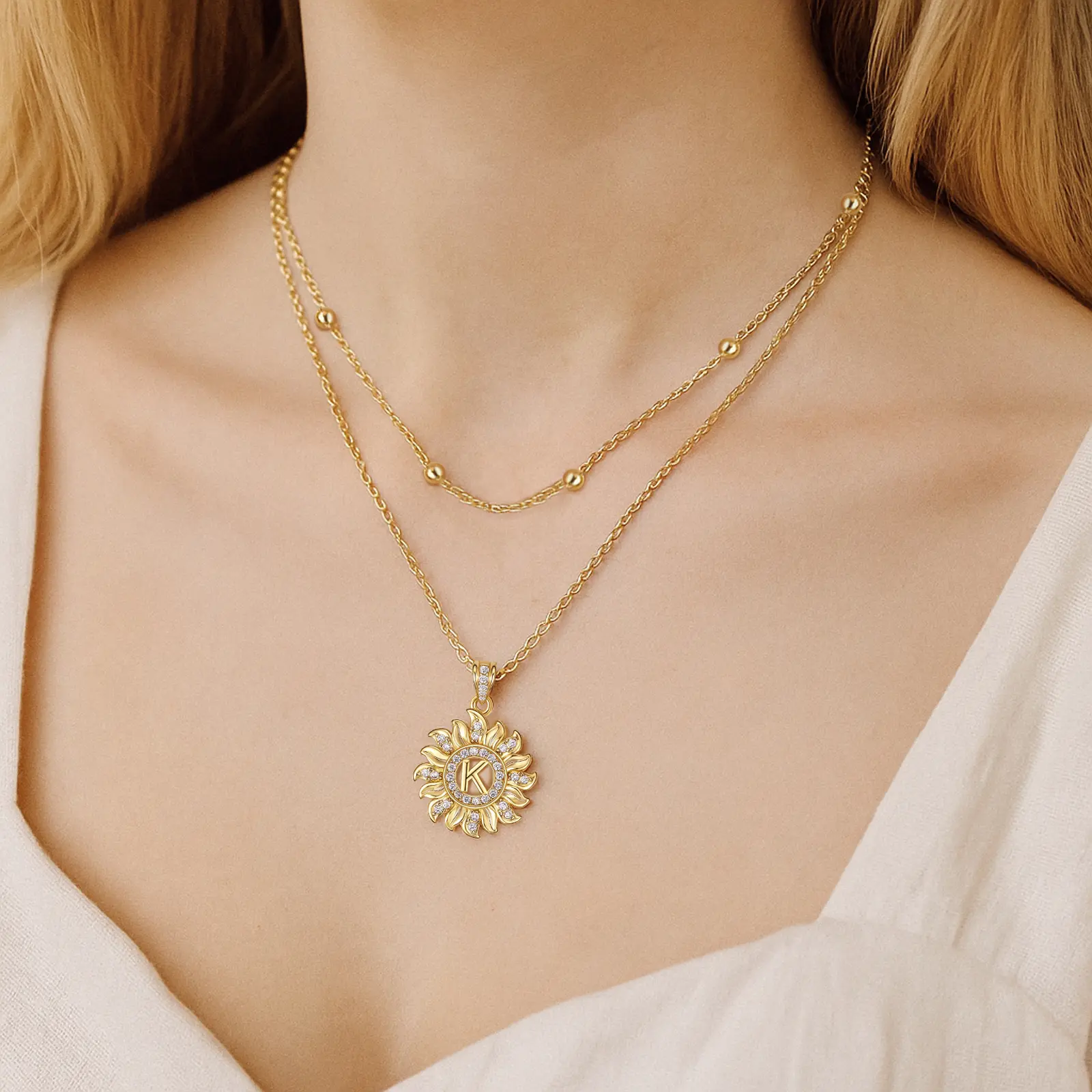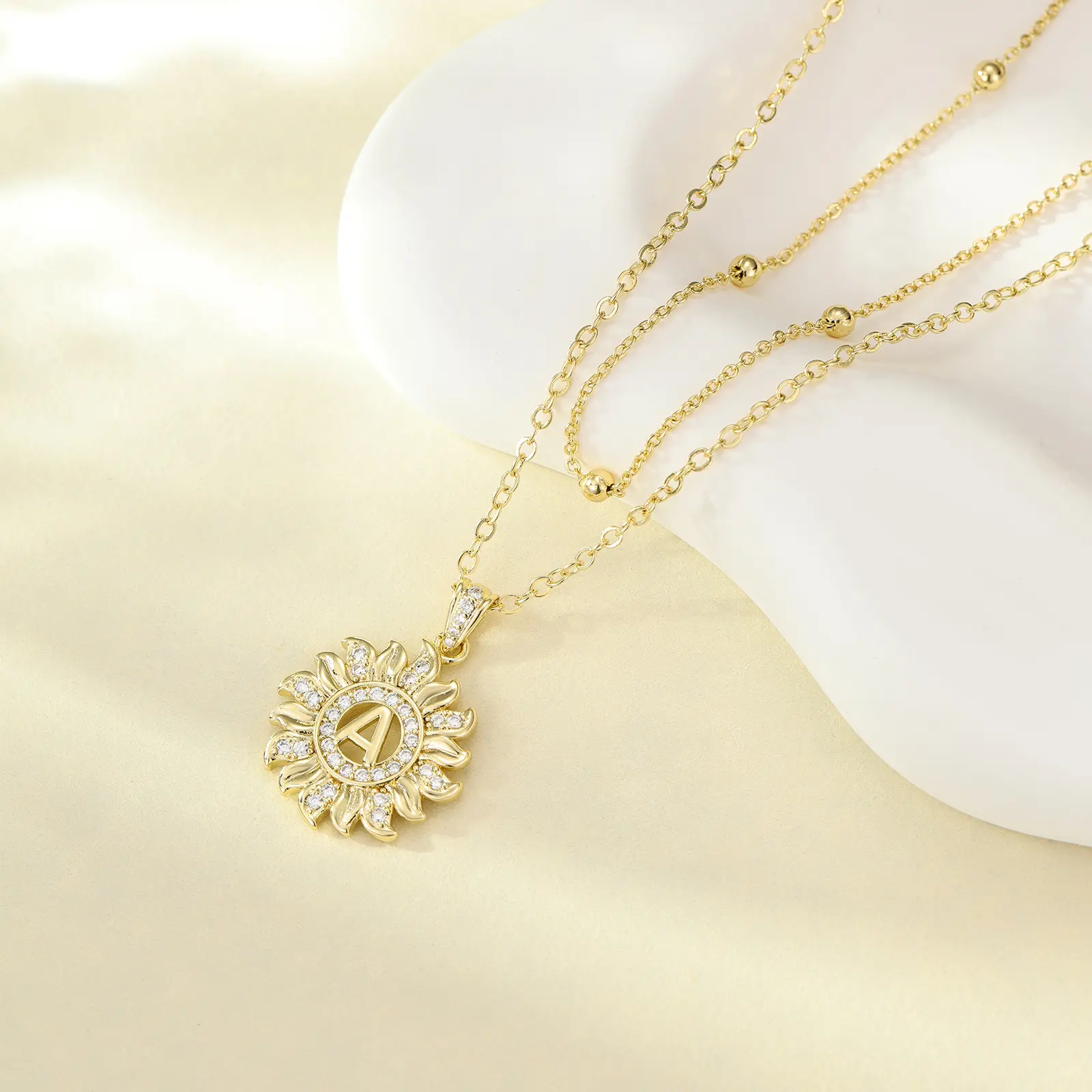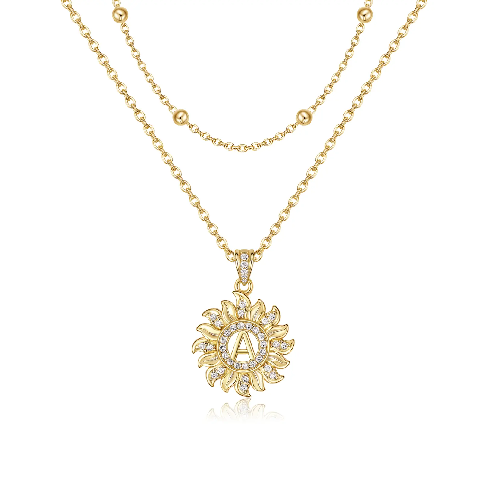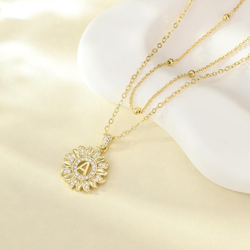 Elevate your style with our Sunflower Initial Necklace. The sunflower pendant, adorned with sparkling AAAA zirconia stones, highlights your chosen initial. This unique design complements any outfit, making it perfect for daily wear or special occasions. It's a versatile accessory that adds a personal touch to your look.