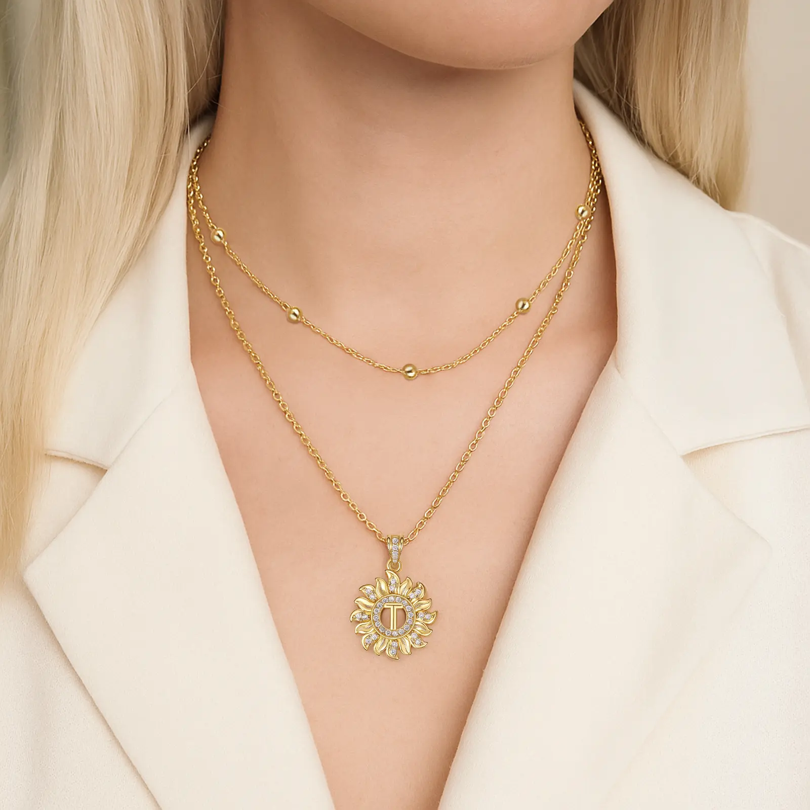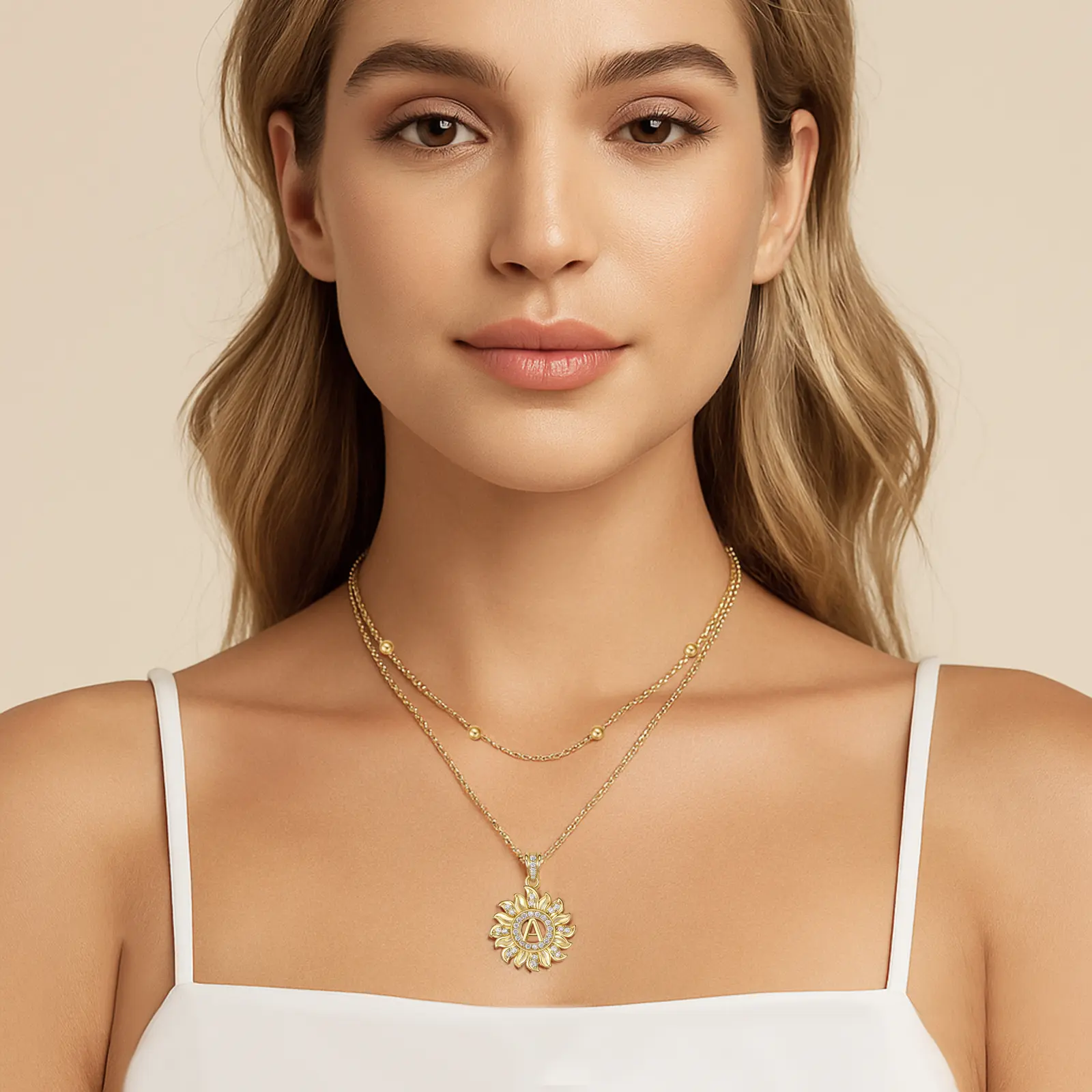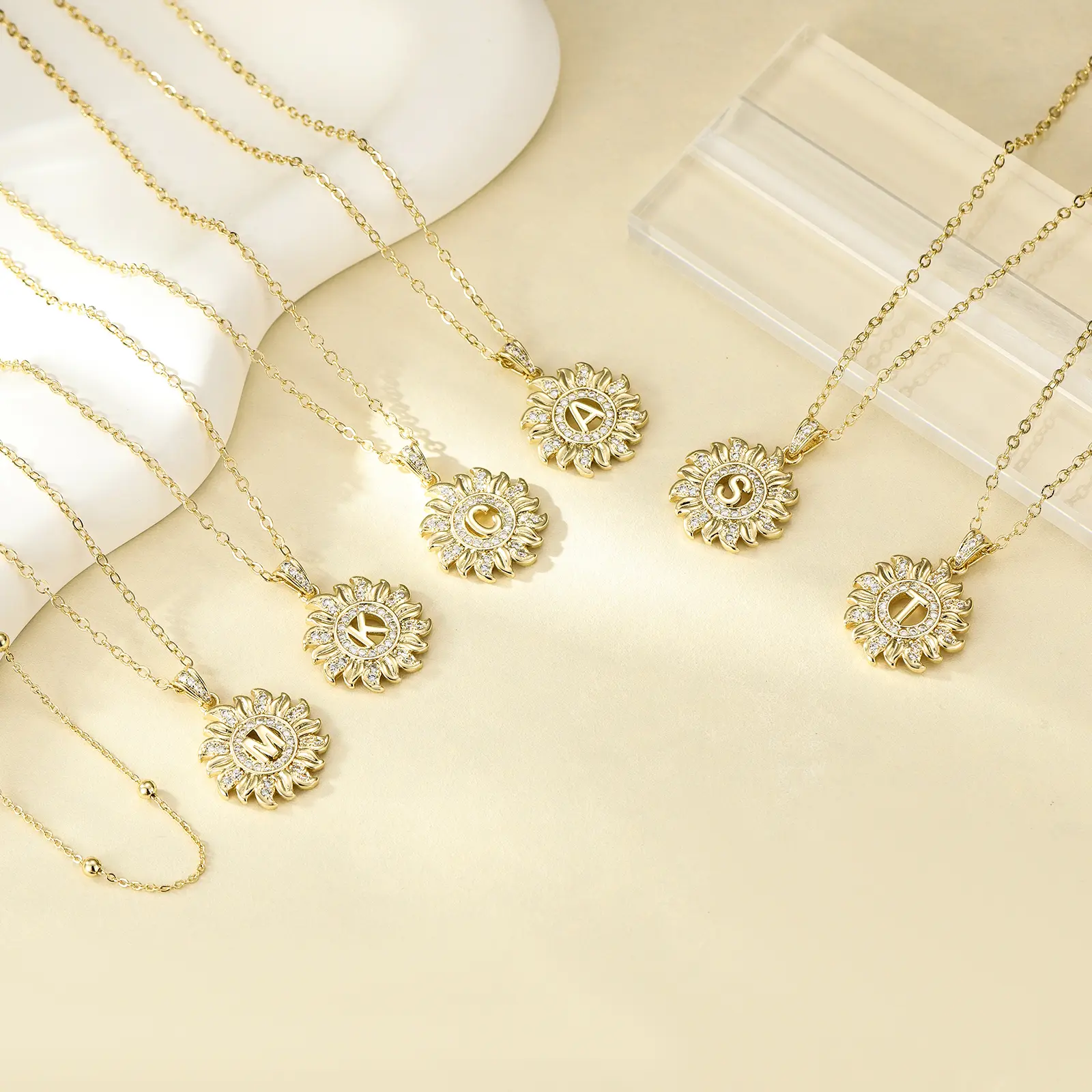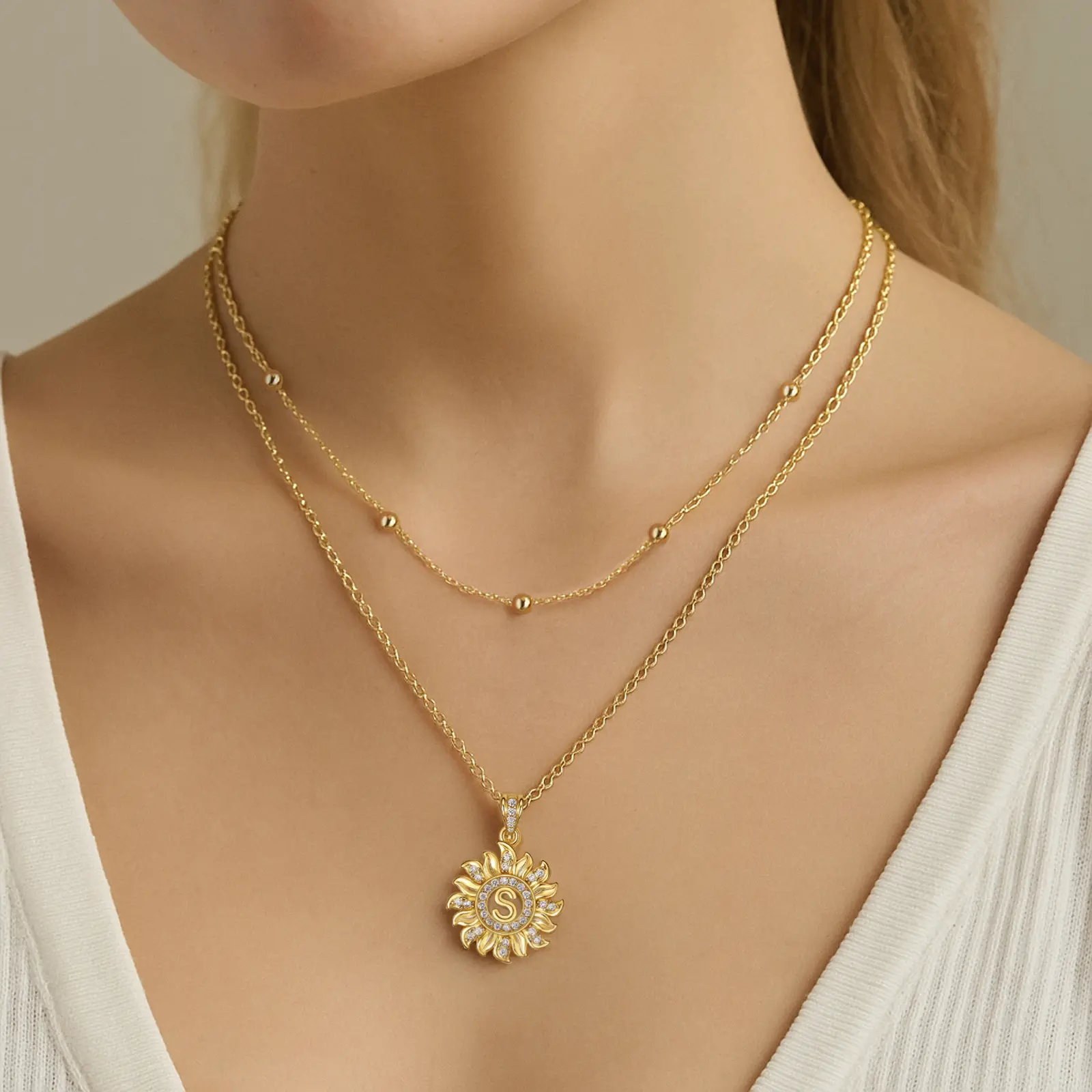 Elevate your style with our Sunflower Initial Necklace. The sunflower pendant, adorned with sparkling AAAA zirconia stones, highlights your chosen initial. This unique design complements any outfit, making it perfect for daily wear or special occasions. It's a versatile accessory that adds a personal touch to your look.