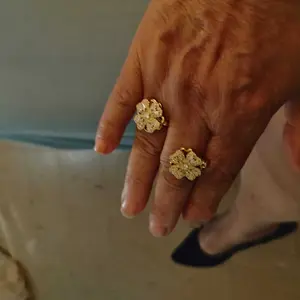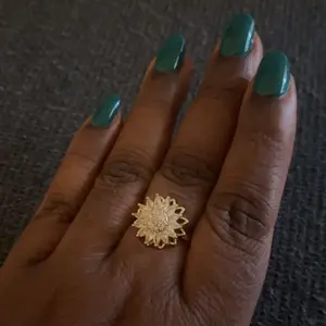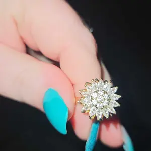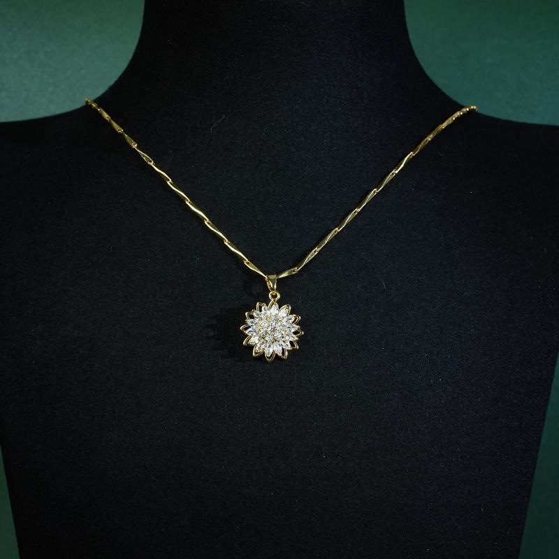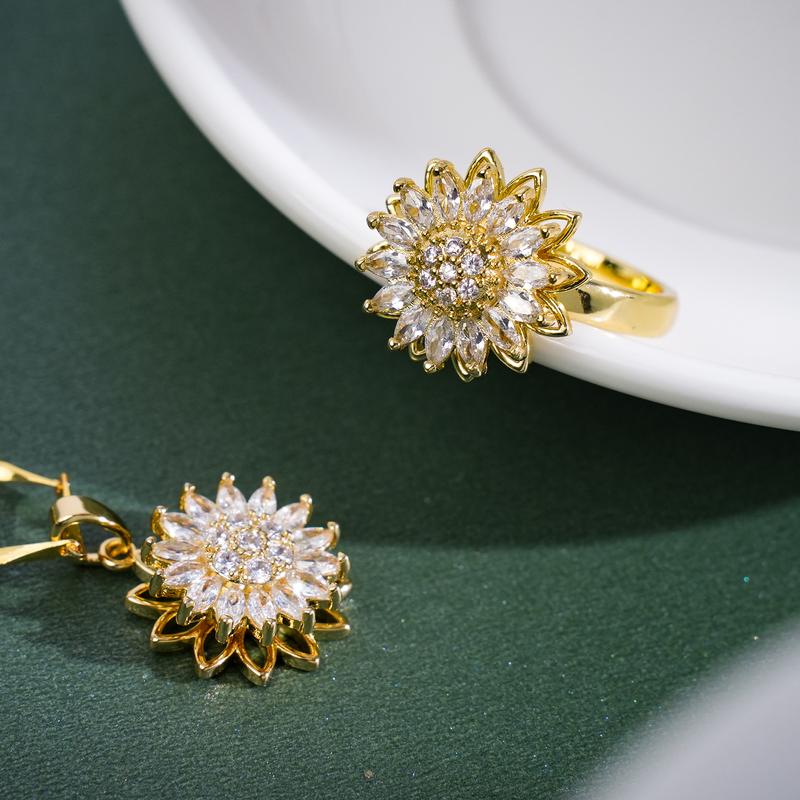 The rotating sunflower pendant and ring, both beautifully adorned with transparent zirconia stones, symbolize positivity, growth, and the warmth of the sun. A perfect representation of nature's beauty.