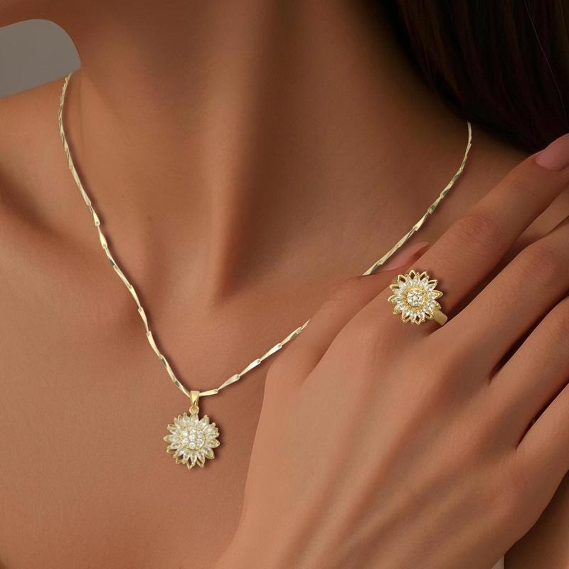 Embrace nature's beauty with this stunning sunflower-inspired jewelry set. Featuring a rotating sunflower design with sparkling zirconia stones, this necklace and ring set will add a touch of elegance and playfulness to any outfit.