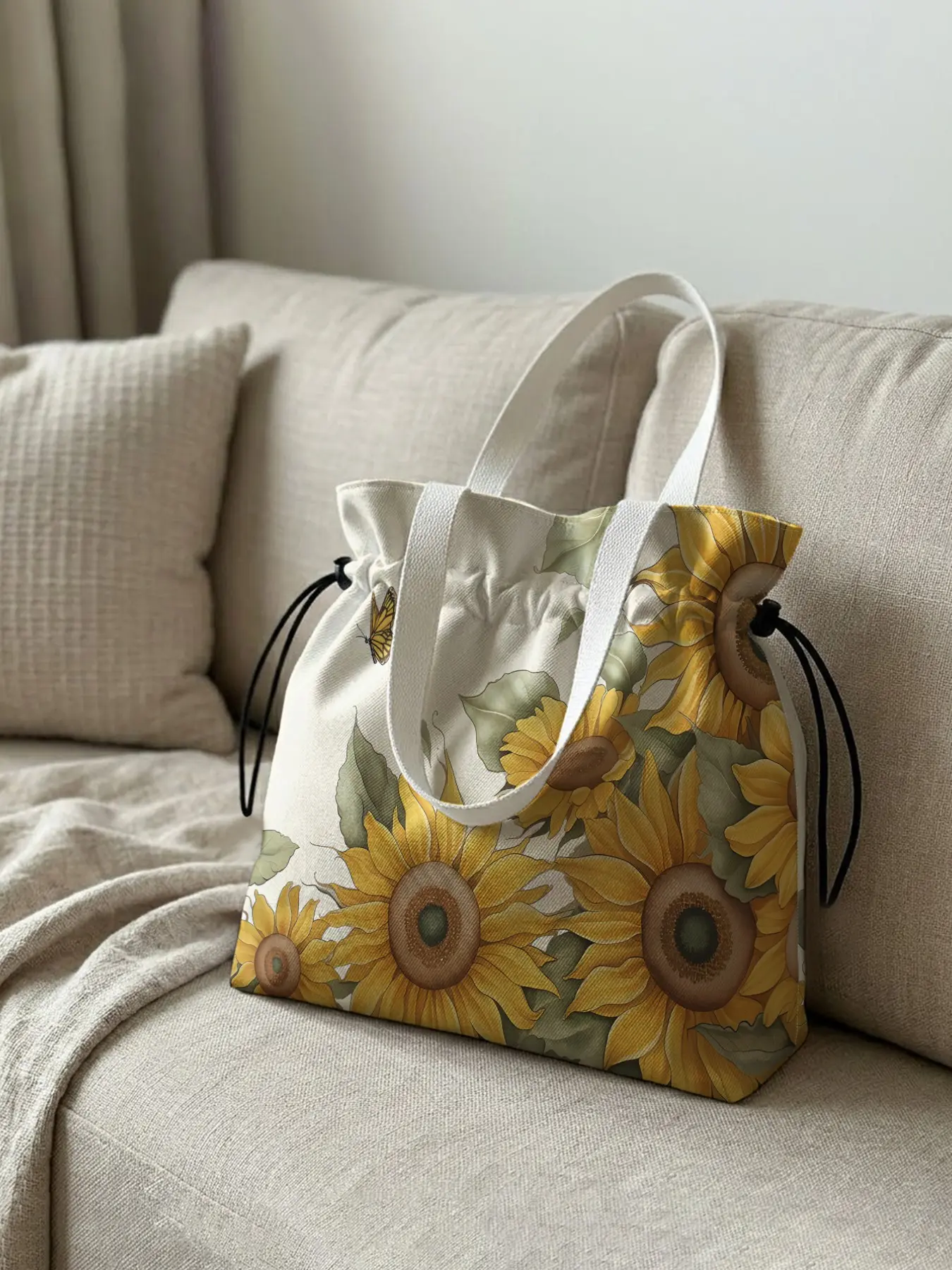 Sunflower Pattern Drawstring Tote Bag, Reusable Tote, Large Capacity Shopping Bag, Durable and Wear-Resistant, Casual Style for Work, Shopping, Picnic