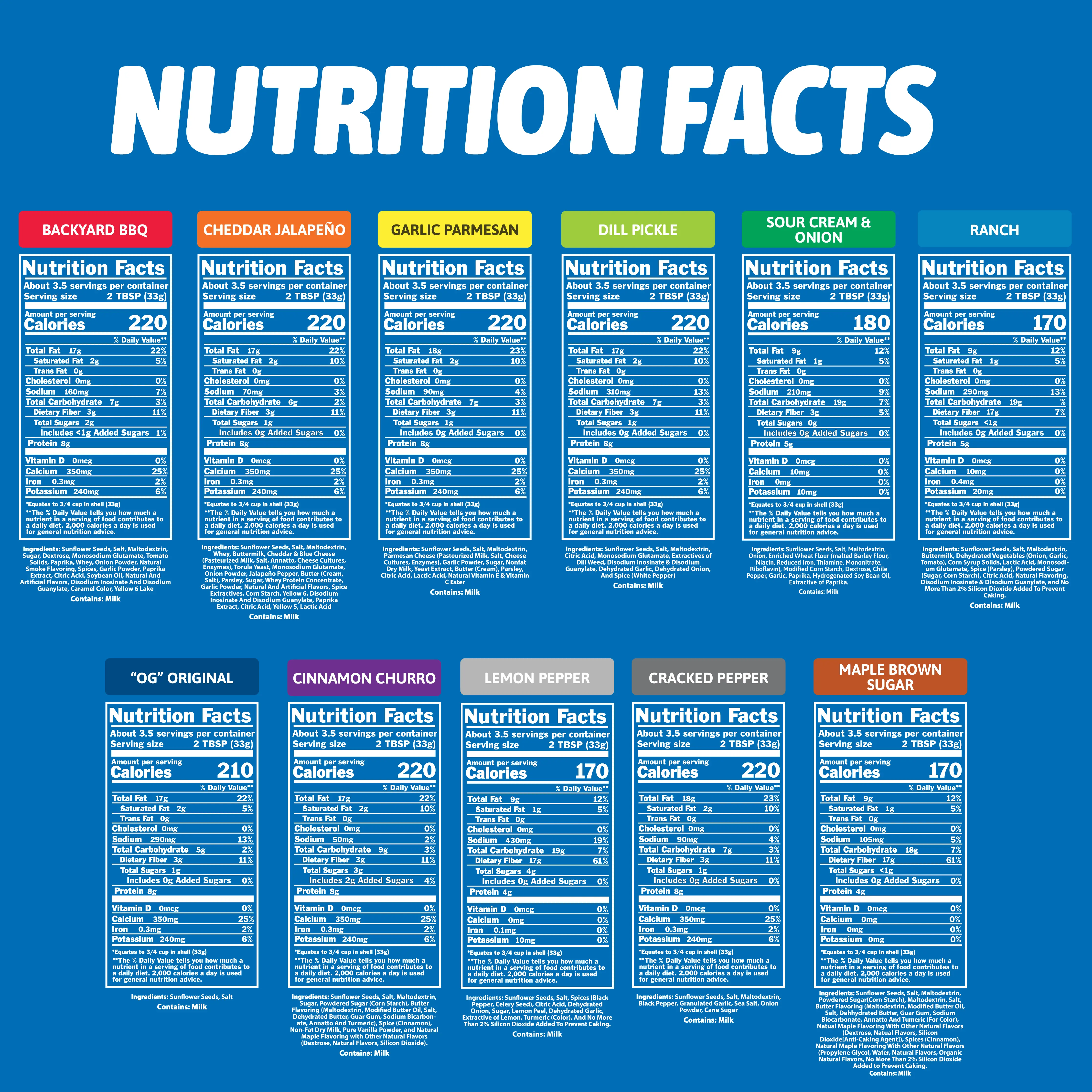 Try all of our classic flavors - Garlic Parmesan, Backyard BBQ, Cracked Pepper, Dill Pickle, Cinnamon Churro, "OG" Original, Cheddar Jalapeño, Ranch, Maple Brown Sugar, Lemon Pepper, and Sour Cream & Onion.