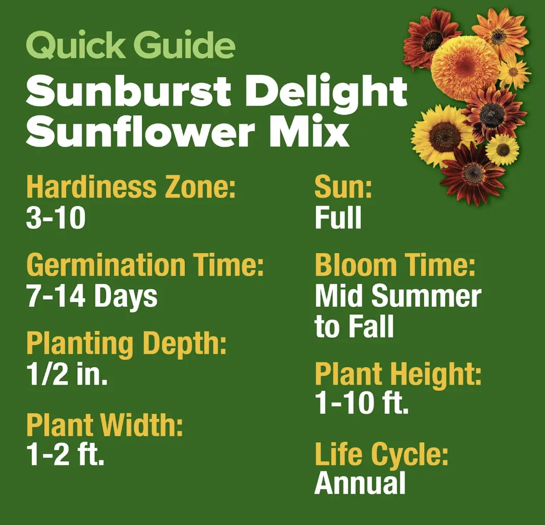 Perfect for any space. From 2-ft Dwarf Sunspot to 10-ft Large Grey Stripe, this mix fits containers, borders, and wide open garden beds.