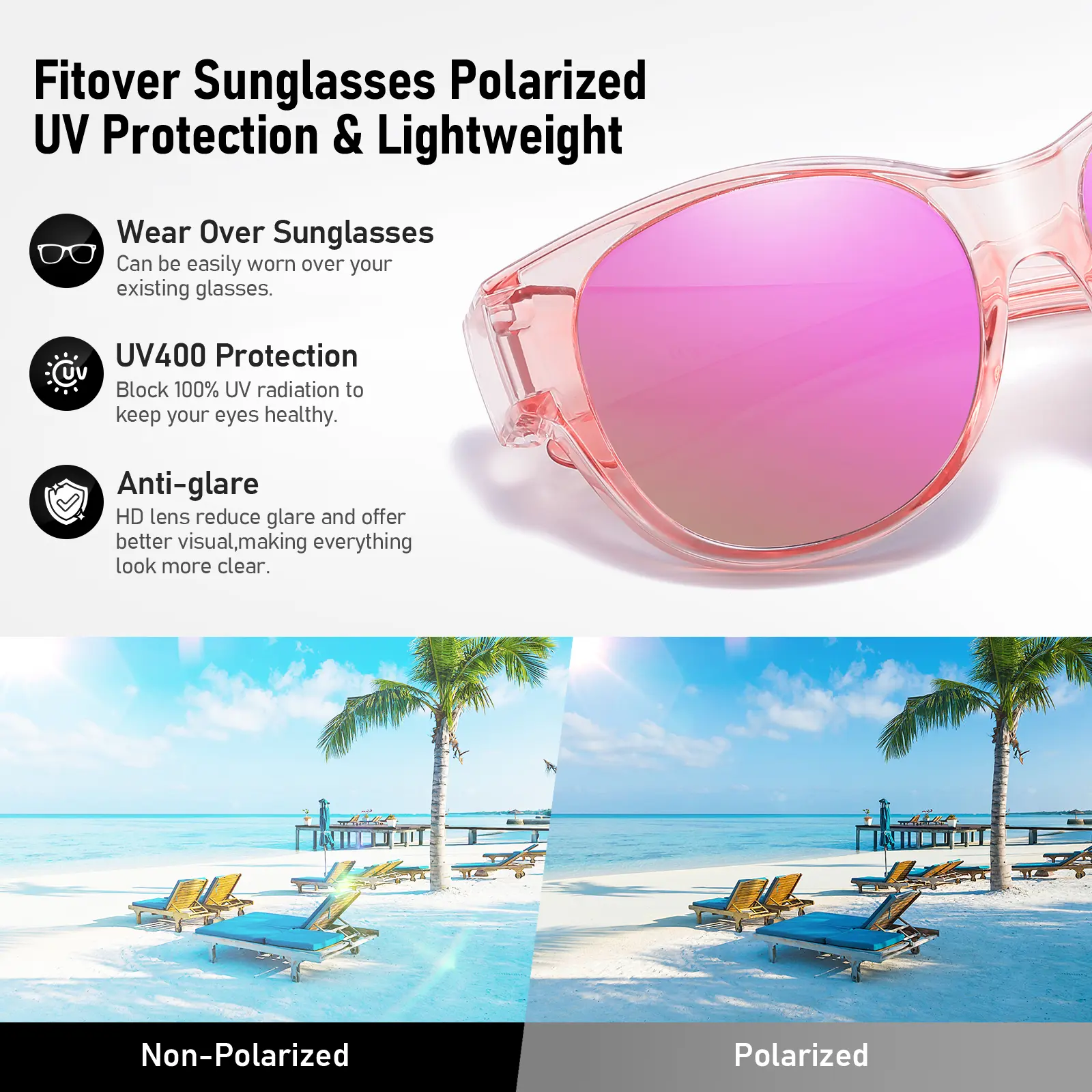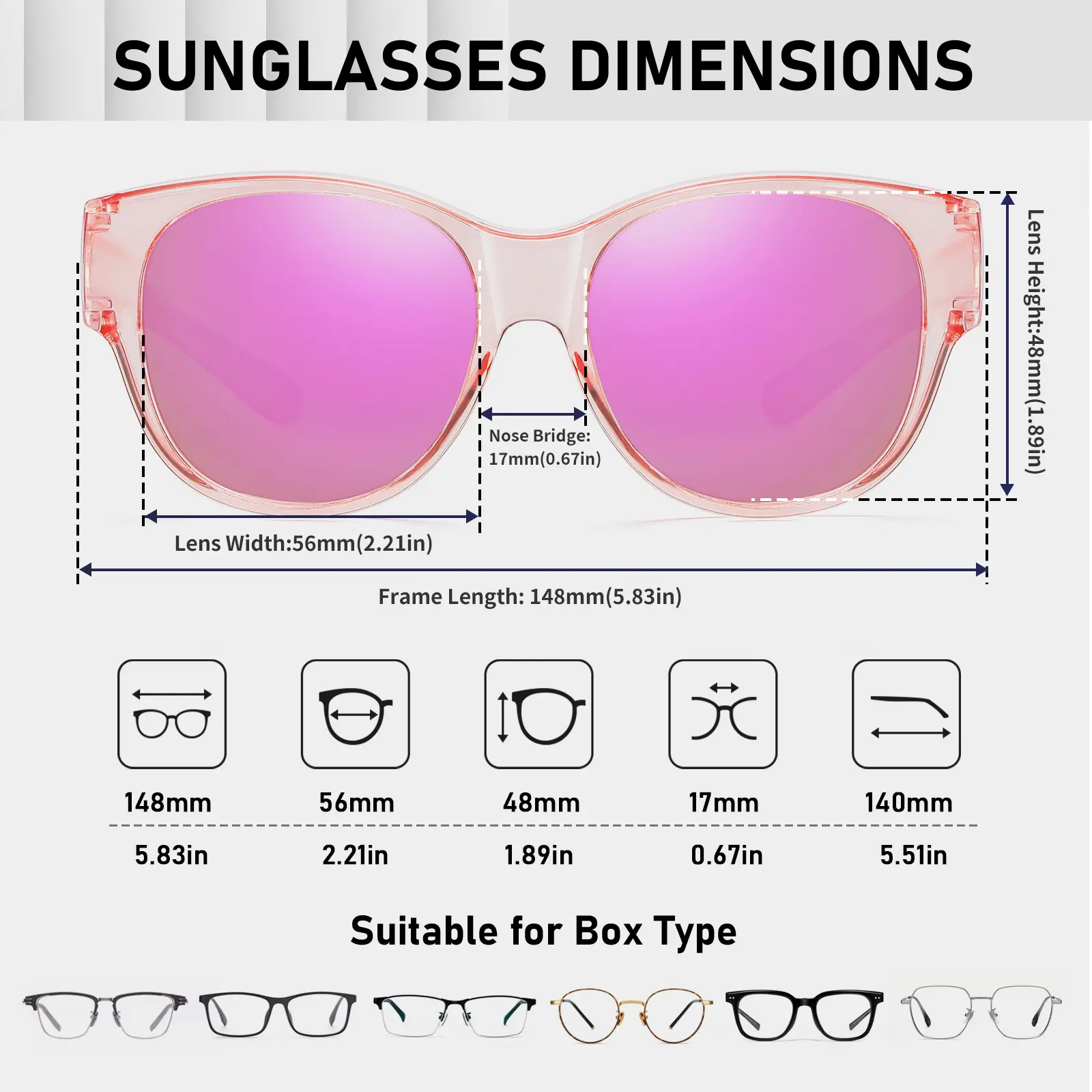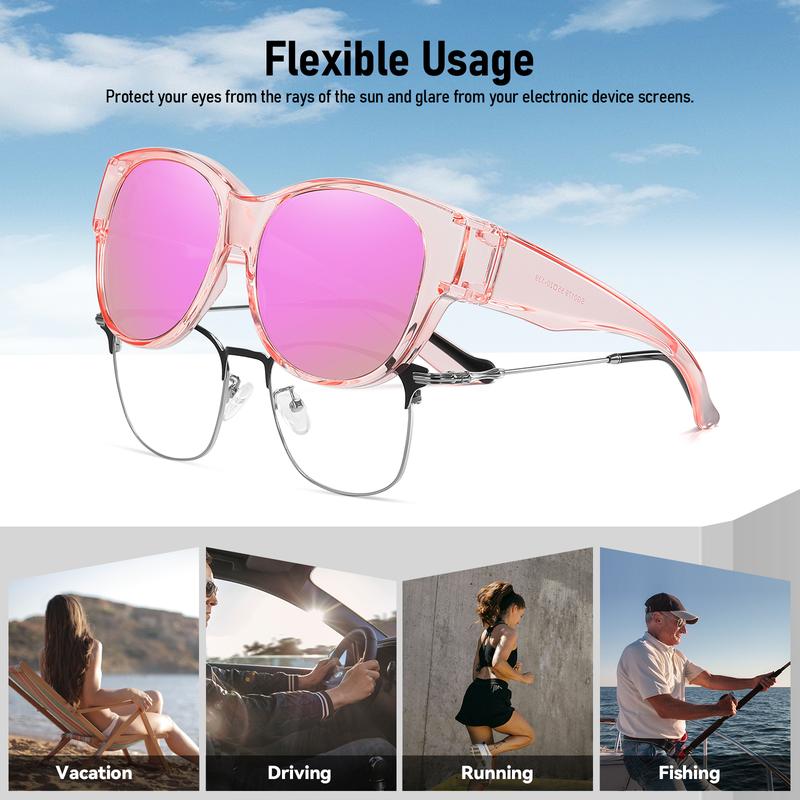 LARGE OVER GLASSES SUNGLASSES FOR WOMEN: The womens fitover sunglasses are specially designed for those who have to wear prescription glasses outdoors and don’t like to wear clip-ons but want to have protection from harmful UV rays from the sun. Polarized sunglasses fit easily over regular glasses and you can take them off anytime