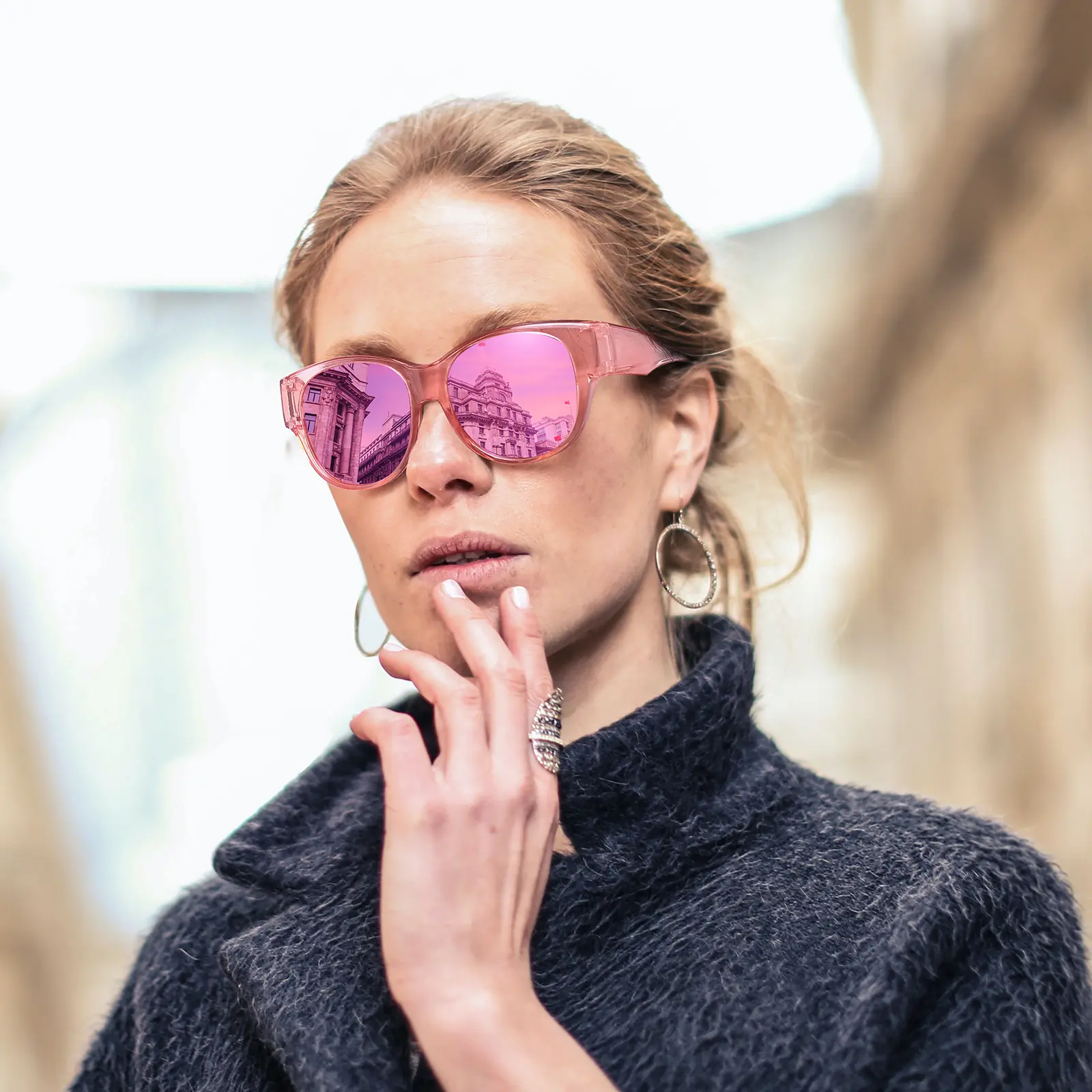 OVERSIZED CAT EYE STYLISH DESIGN: Oversized lenses of our cat eye wrap around sunglasses provide greater coverage to protect eyes from annoying glare. Trendy cateye design are keeping up closely with the latest fashion trend. Several colors available for ultralight top cover sunglasses over eyewear: black, grey, pink, blue mirrored, purple, silver, etc, go well with various features and clothing, well attached to all kinds of faces, even big head