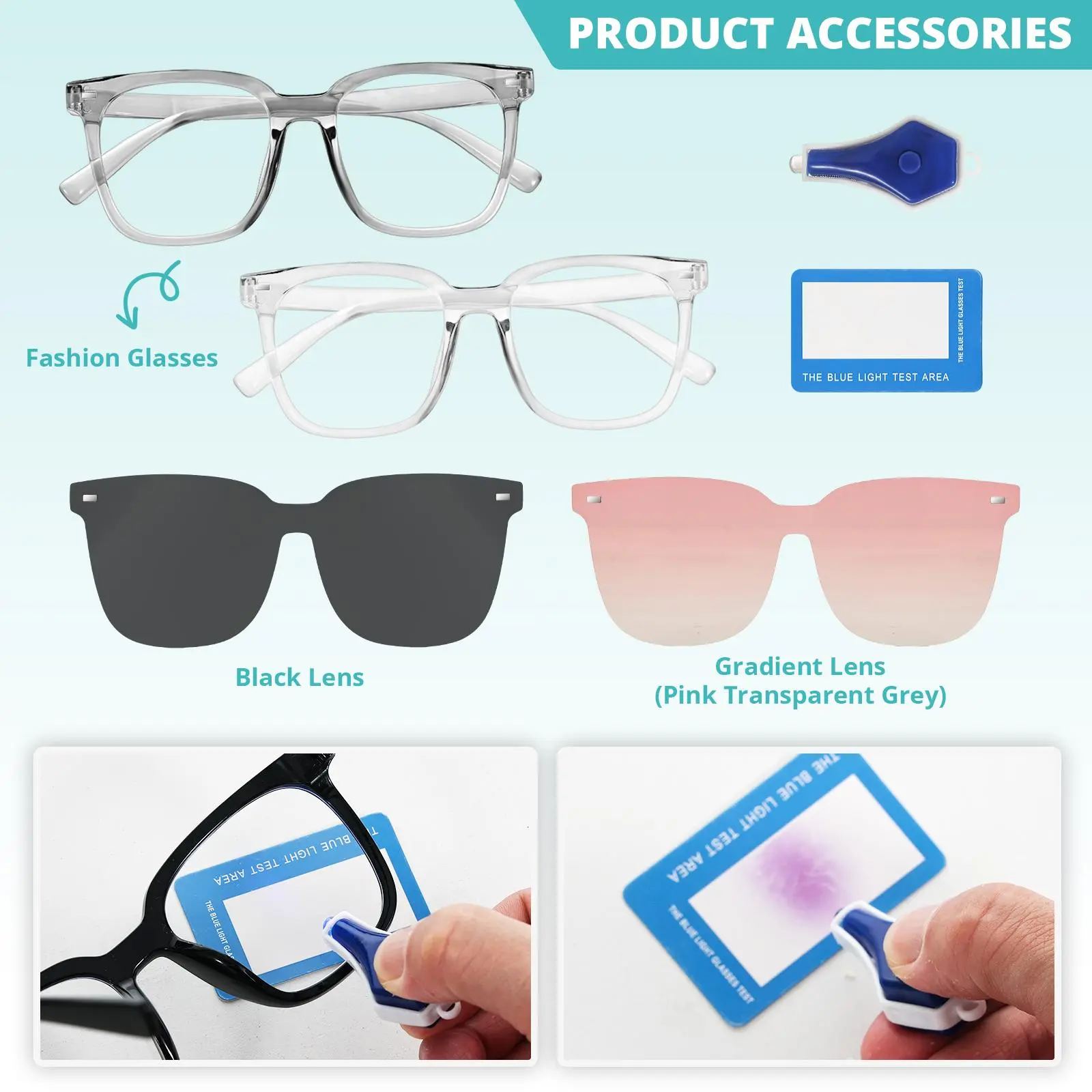 ·【Product Includes】A pair of transparent anti-blue light frames, two pairs of magnetic sunglasses lenses, a piece of eyeglasses cloth, and a soft eyeglasses pouch case.