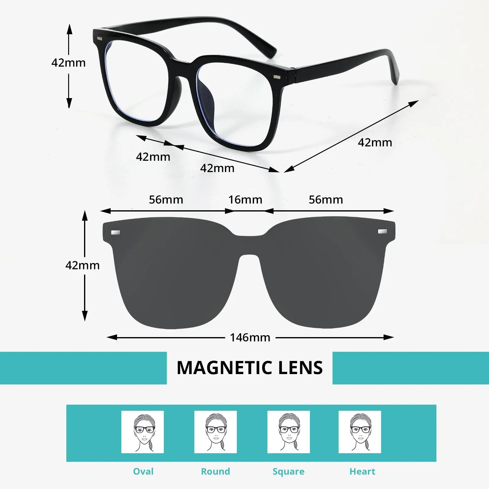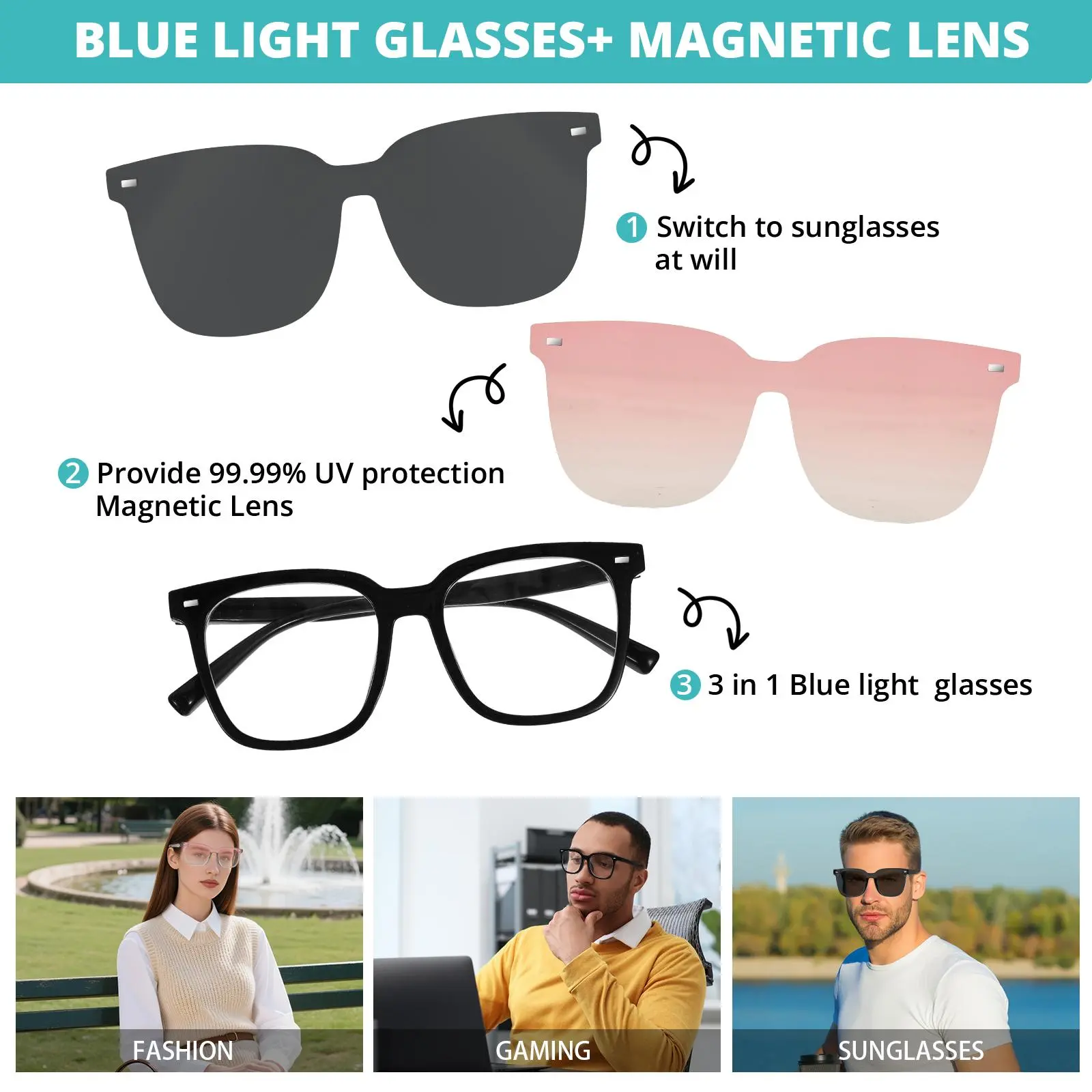 Sunglasses for Travel Use,Blue Light Blocking Glasses with 2 Pack Magnetic Clip on Lens, Fashion Glasses for Women Men, Gaming TV Phone Glasses Eyewear Shiny Black Frames Square Frames Eyeglass