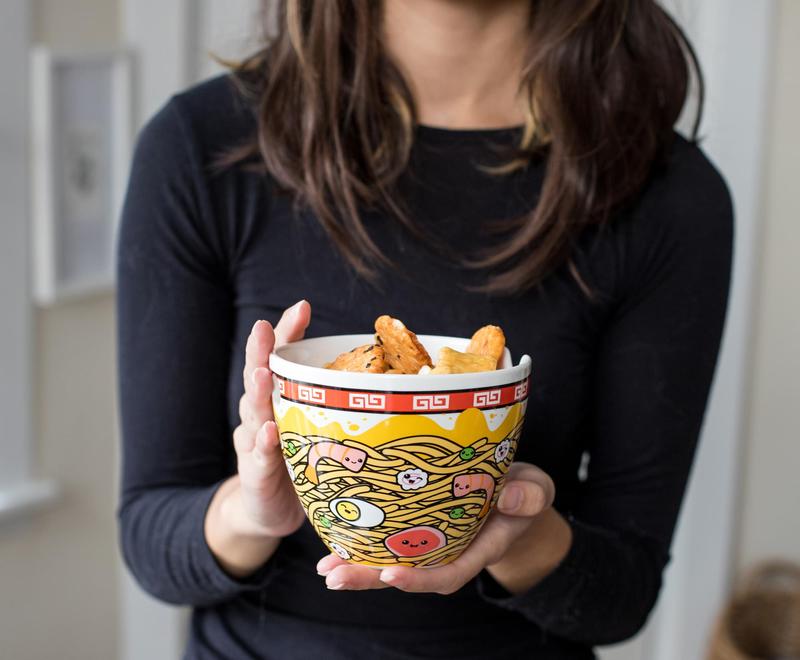 Slurp noodles in style using this fun ramen bowl! White ramen bowl with red trim features a fun wraparound design of animated food characters swimming in a sea of yummy looking noodles. Roomy ceramic ramen bowl holds approximately 16 ounces of your favorite noodles and comes complete with a set of wooden chopsticks.