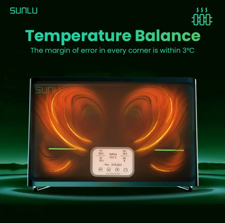 ๐ก๏ธ Temperature Balance ๐ก๏ธ - Left and right side circulating fans - Bottom heating fan - Ensures balanced temperature ยฑ3โ - Perfect drying effect for all parts
