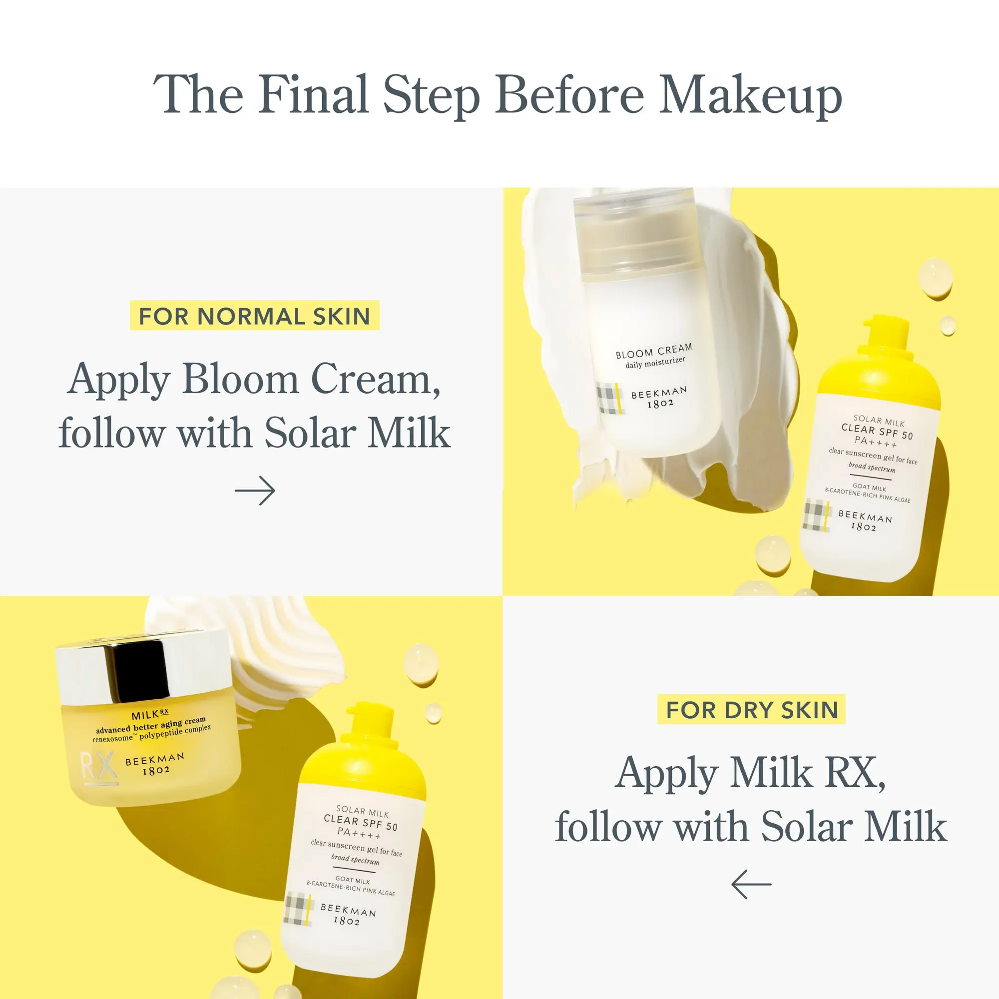 I can’t say enough about this Solar Milk Clear SPF Sunscreen Gel. Light weight, soft gel, no peeling, NO WHITE CAST! Wear alone leaving a hydration shine or as a primer under makeup with added skincare! I wear it daily before my skin tint or foundation