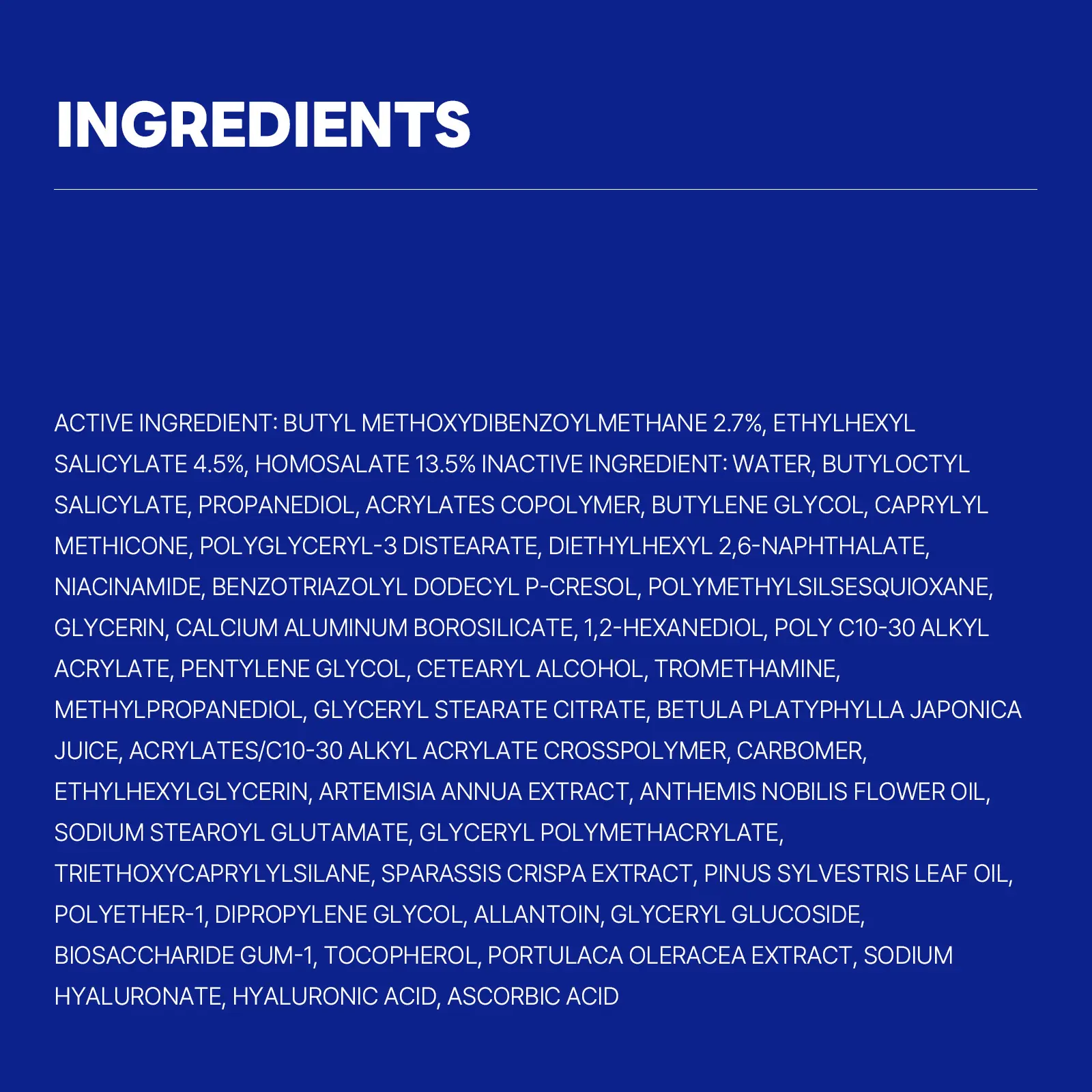IngredientsWater,Dibutyl Adipate,Propanediol,Diethylamino Hydroxybenzoyl Hexyl Benzoate,Polymethylsilsesquioxane,Ethylhexyl Triazone,Niacinamide,Methylene Bis-Benzotriazolyl Tetramethylbutylphenol,Coco-Caprylate/Caprate,Caprylyl Methicone,Diethylhexyl Butamido Triazone,Glycerin,1,2-Hexanediol,Butylene Glycol,Betula Platyphylla Japonica Juice(1,425ppm),Sodium Hyaluronate,Hyaluronic Acid,Glyceryl Glucoside,Dipotassium Glycyrrhizate,Allantoin,Portulaca Oleracea Extract,Artemisia Annua Extract,Pinus Sylvestris Leaf Oil,Anthemis Nobilis Flower Oil,Acrylates/C10-30 Alkyl Acrylate Crosspolymer,Sodium Stearoyl Glutamate,Polyacrylate Crosspolymer-6,Ethylhexylglycerin,Ascorbic Acid,Adenosine,Pentylene Glycol,Behenyl Alcohol,Poly C10-30 Alkyl Acrylate,Polyglyceryl-3 Methylglucose Distearate,Decyl Glucoside,Tromethamine,Xanthan Gum,t-Butyl Alcohol,Tocopherol,Carbomer