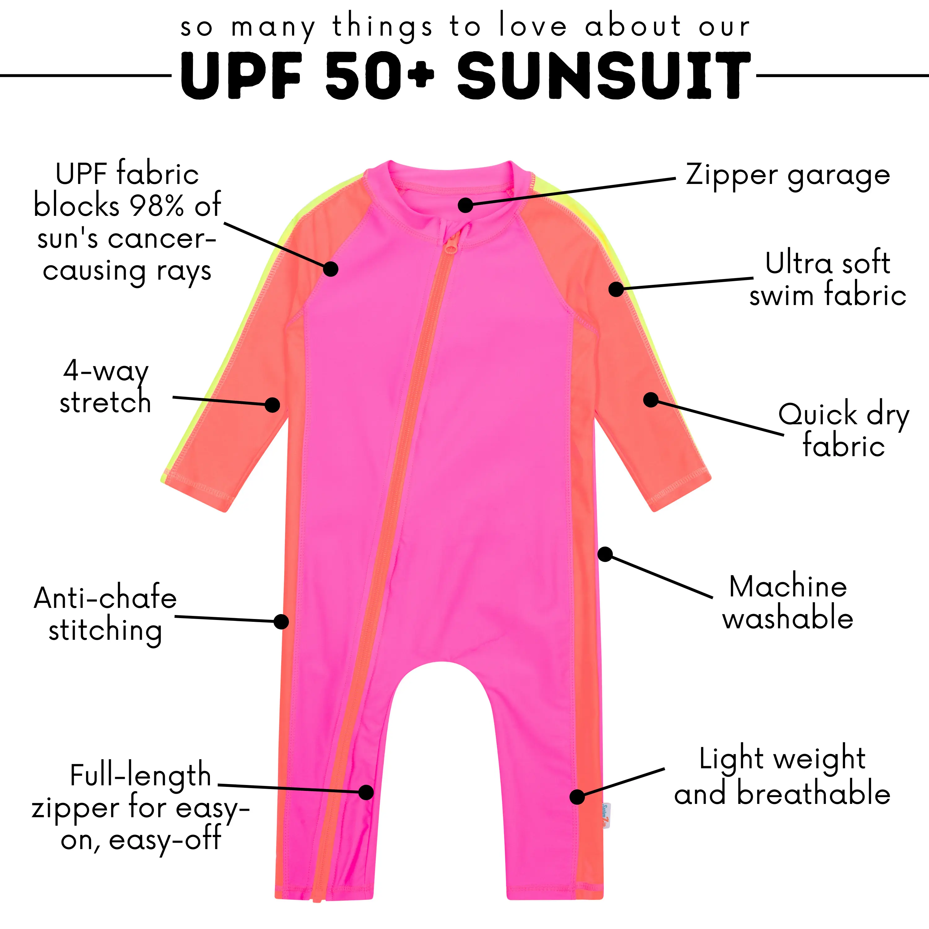 Our infant and toddler long sleeve sunsuit is full of features to make fun-in-the-sun a breeze. With neck to wrist to ankle sun protection, there will be no more sunscreen-slick wiggly little, squirming out of your arms. They are protected from the sun’s rays anywhere this sunsuit covers!