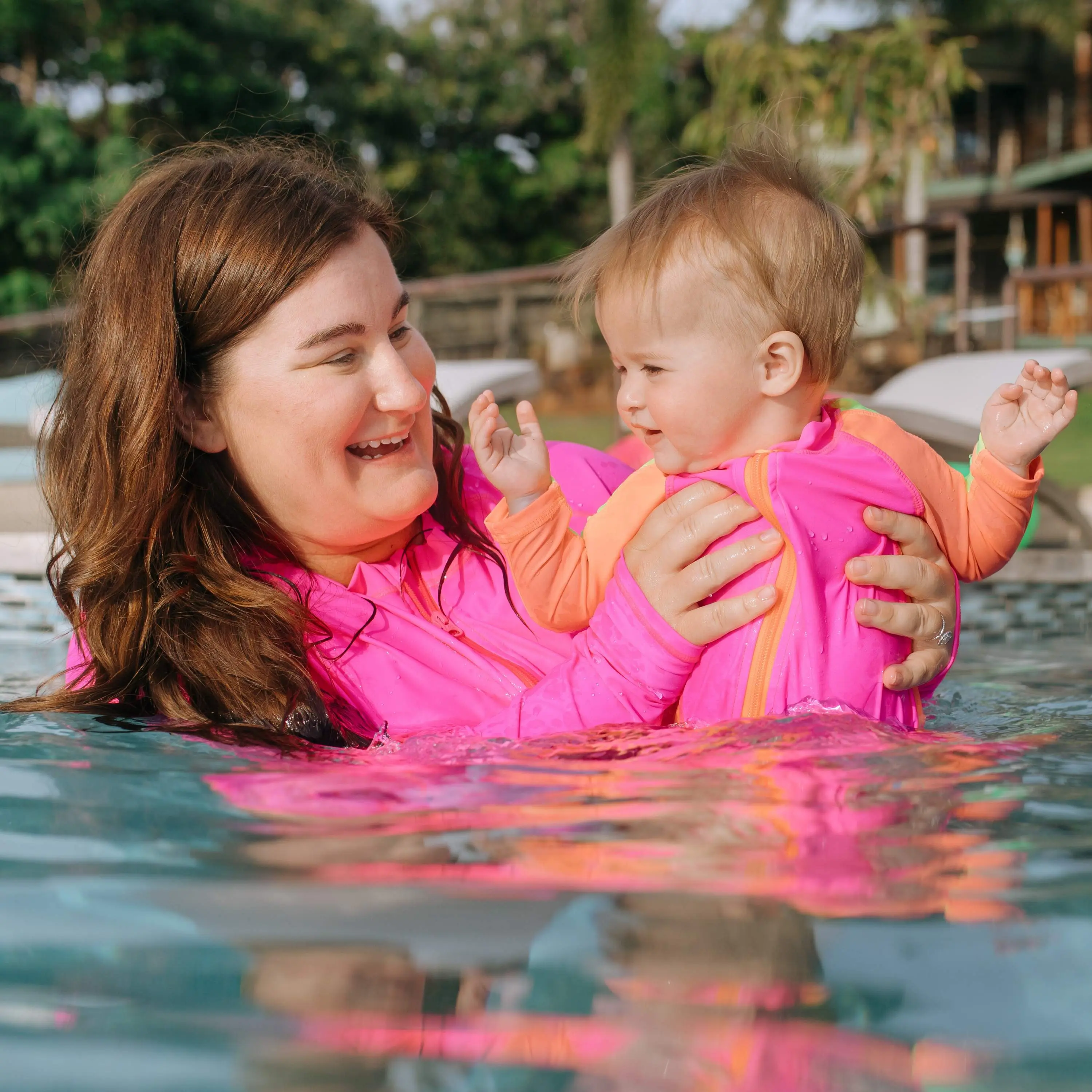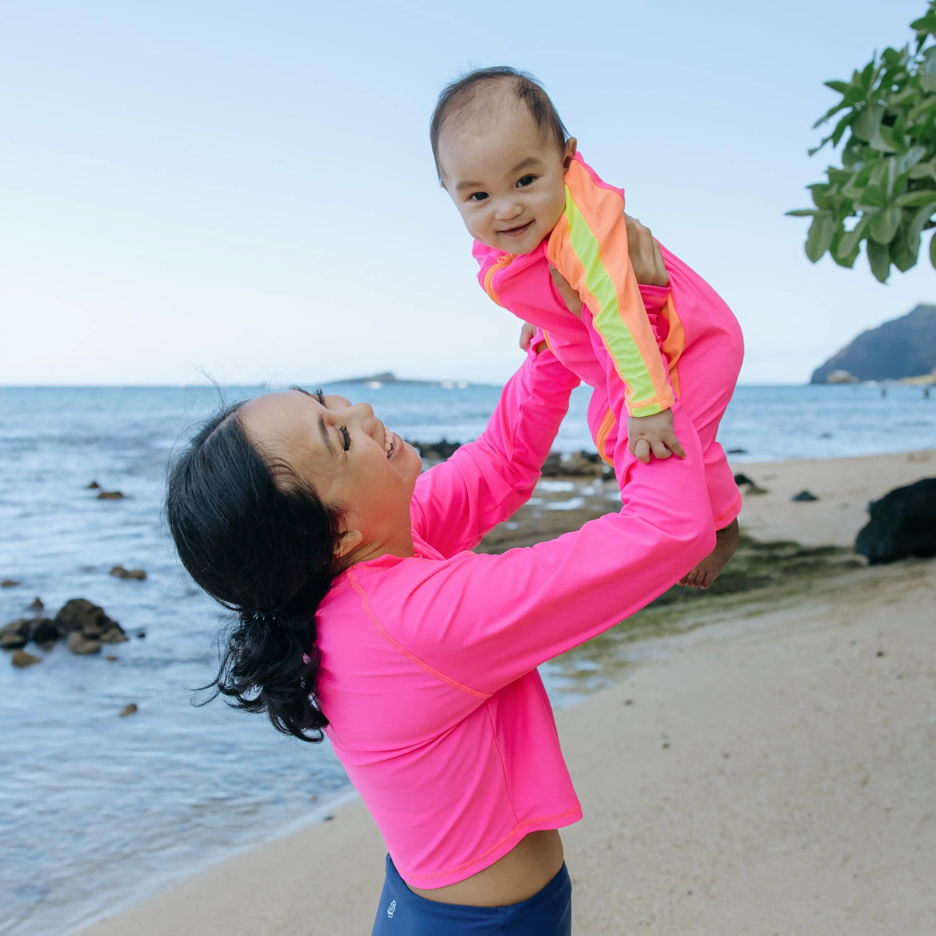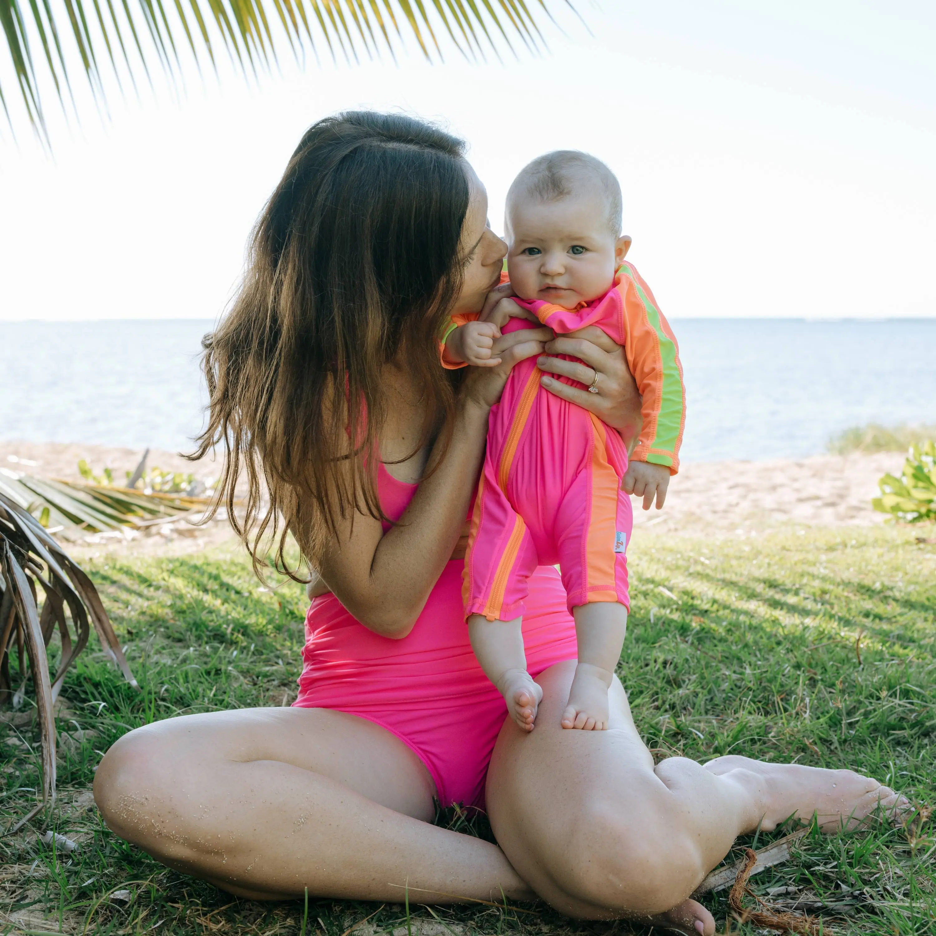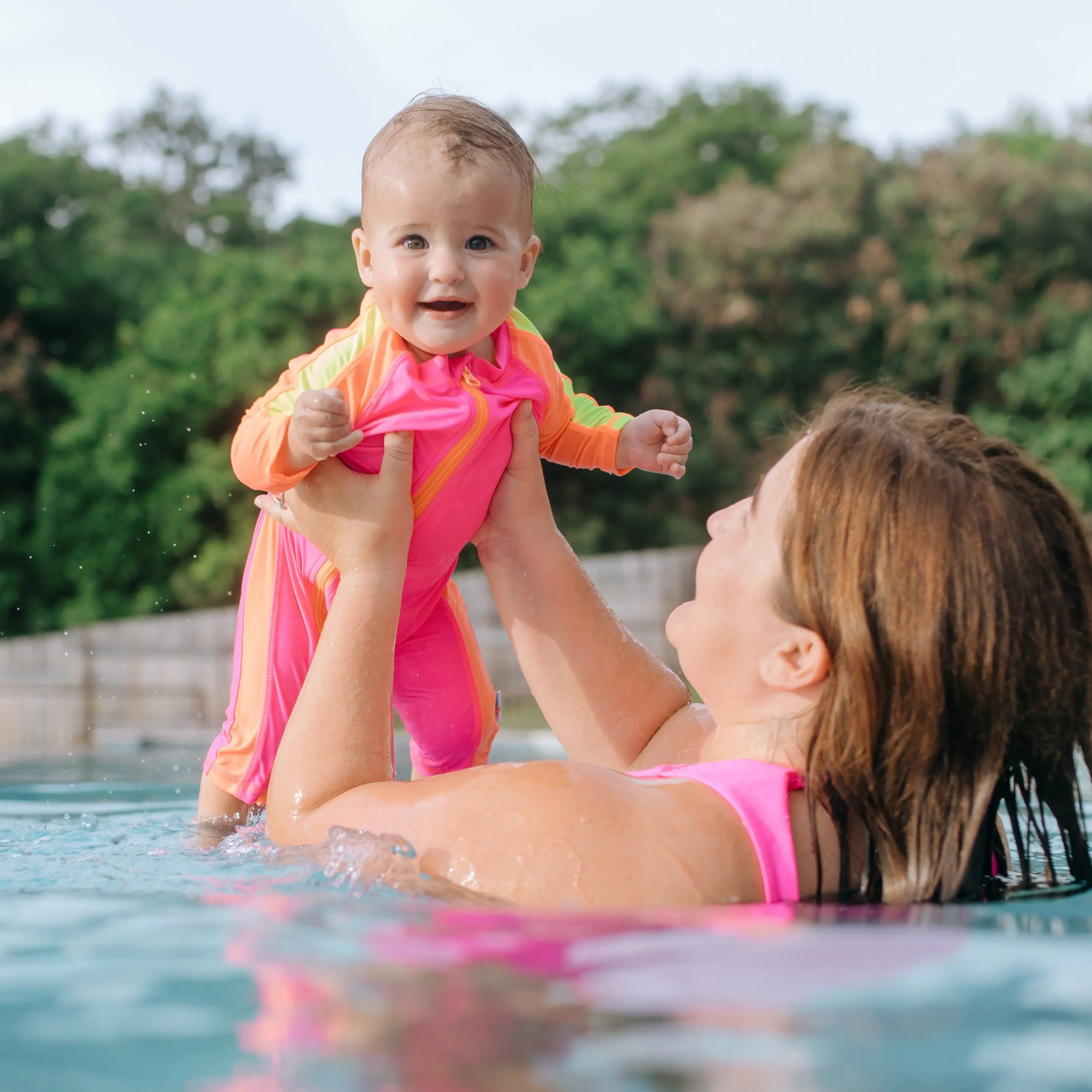 There has been much recent discussion about bathing suit color safety and the best swimsuit colors underwater. This vivid neon pink and orange, with neon yellow highlight along the sleeves, is one of the best swimsuit color combos for safety ...and it’s just too cute!