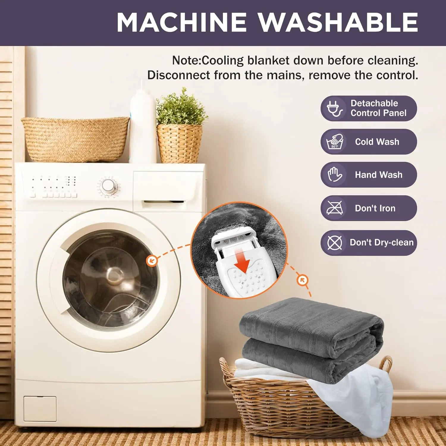 ·【Easy to Use & Machine Washable】The 6.1FT power cord+13.3FT controller cord provides plenty of length, keeps you warm whether you are resting on the bed, napping on the couch or worqueen in the office. Upgraded machine washable design makes the maintains of the heated blanket very easy and extends the service life. Just take off the heating controller and put the electric blanket in the washing machine.