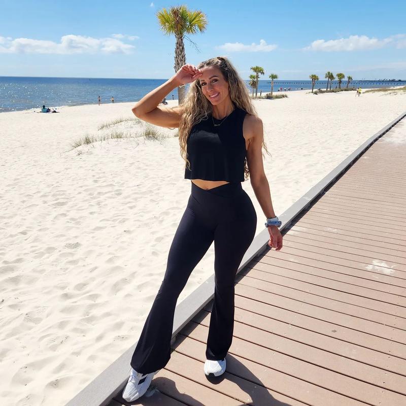These Sunzel women's flare leggings offer a seamless, comfortable, and flattering fit, perfect for yoga, workouts, and everyday wear. The V crossover waistband and no front seam design ensure a smooth and stylish look.