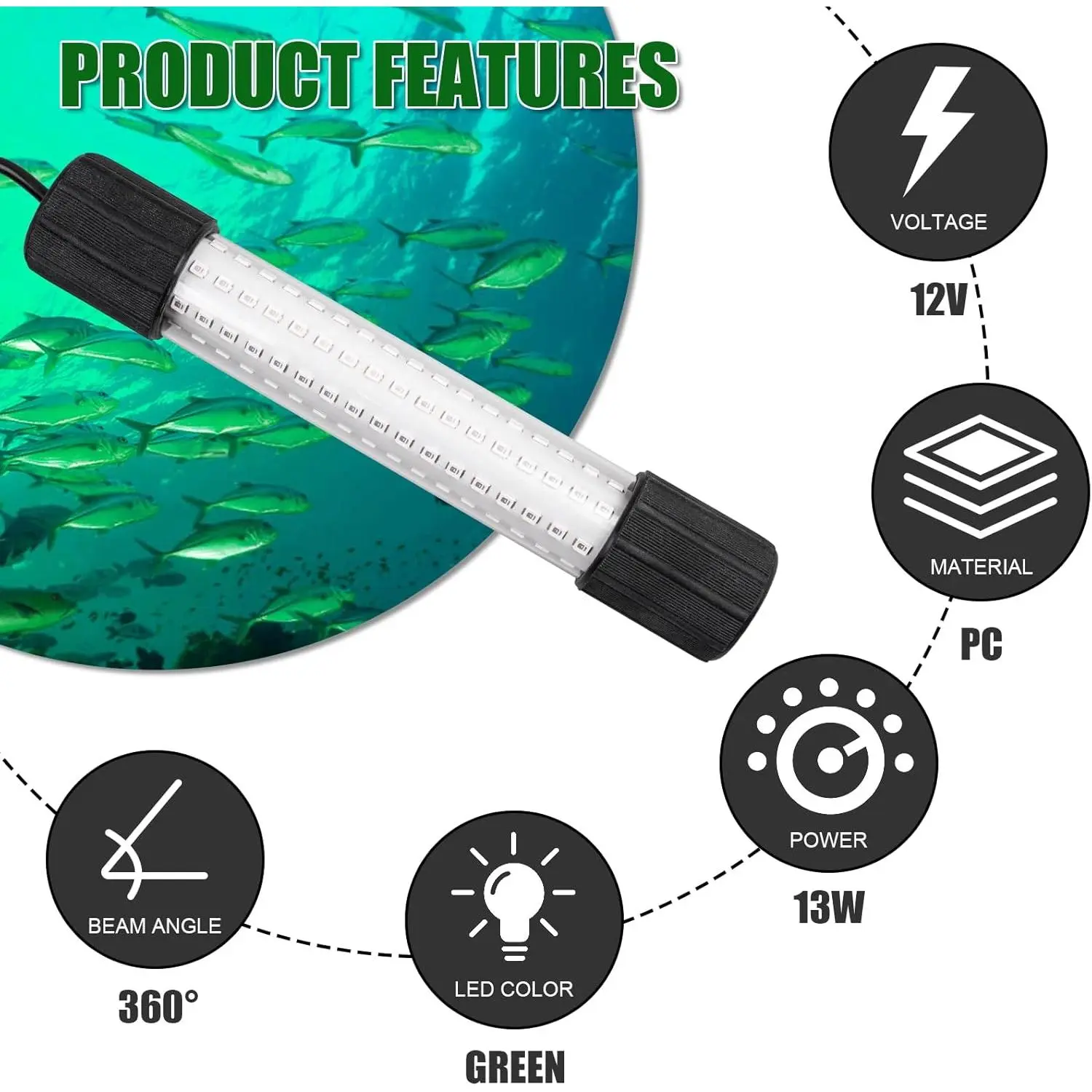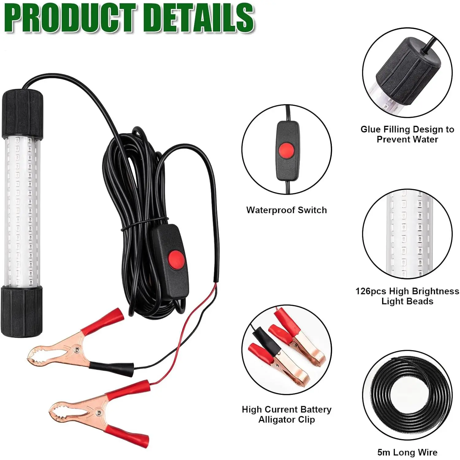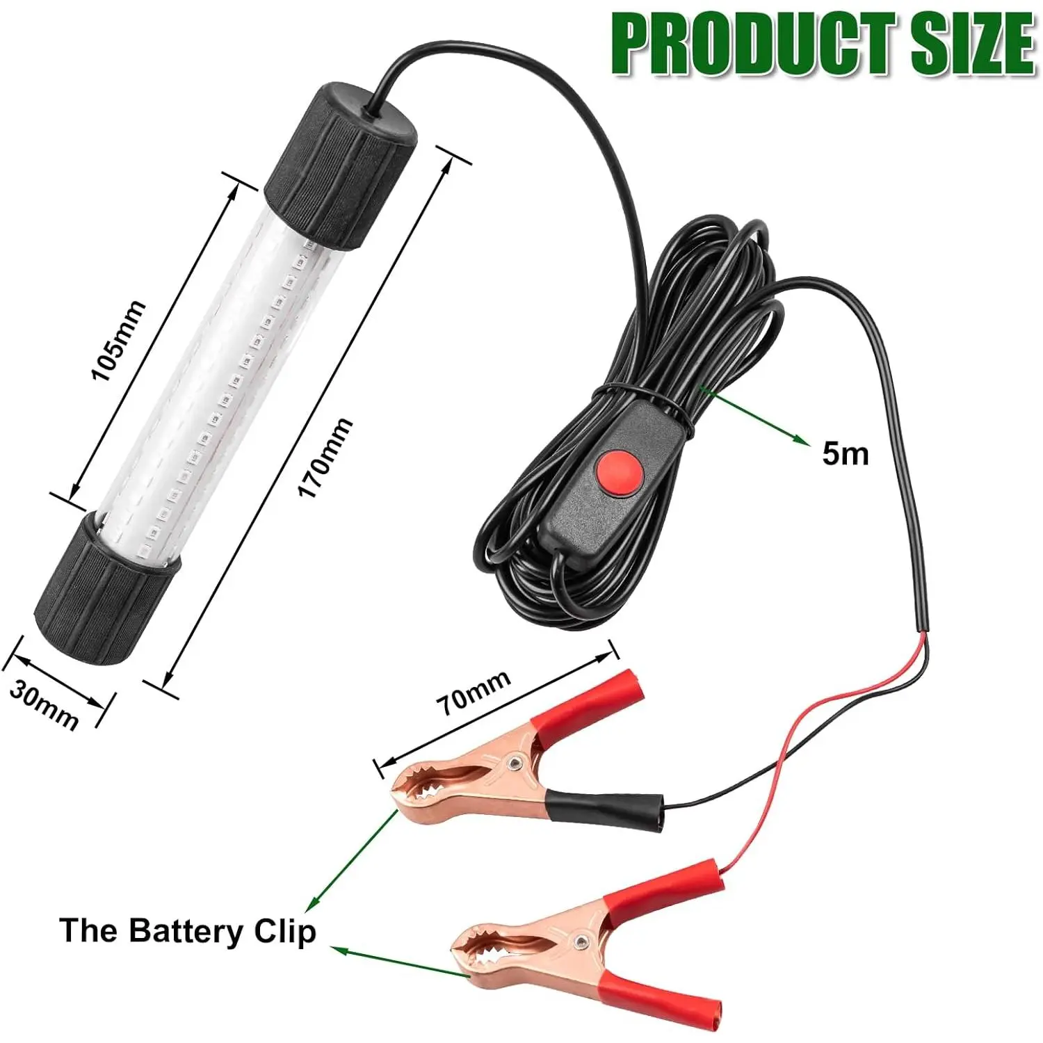 In our quest for excellence in the angling experience, we introduced our super bright underwater green fishing light.As a brand dedicated to providing innovative tools for fishing enthusiasts, we are inspired by passion and technology to make your fishing trips more fun and successful. Quality Trust Basis: The 13W power of the super bright fishing lights led underwater is equipped with 126 high brightness LEDs, providing a full 360-degree light angle, effectively attracting more fish and making fishing easier.We adopt IP68 grade waterproof design to ensure the use under 5 metres of water, providing you with a safer using experience. This underwater lights for fishing has a leak-proof design, the surface and interior are filled with strong epoxy resin, effectively preventing air and water spray from entering the interior.Equipped with a battery clip and car cigarette lighter adapter for quick and easy power connection.Please note that this product is only suitable for underwater use. Product Parameters: Power: 13W LED quantity: 126pcs Waterproof rating: IP68 (5 metres underwater) Angle: 360 degree full light angle Packaging Information: Each super bright underwater fishing light is carefully packaged to ensure its safety during transit.We pay attention to details and provide you with good products to ensure you receive the fishing lights led underwater. Widely Used: This LED green light for fishing is widely used on boats, kayaks, canoes and fishing docks to attract shrimp, squid, phytoplankton and more. Ideal for your fishing trip, this fish attracting light adds colour to your fishing trip!