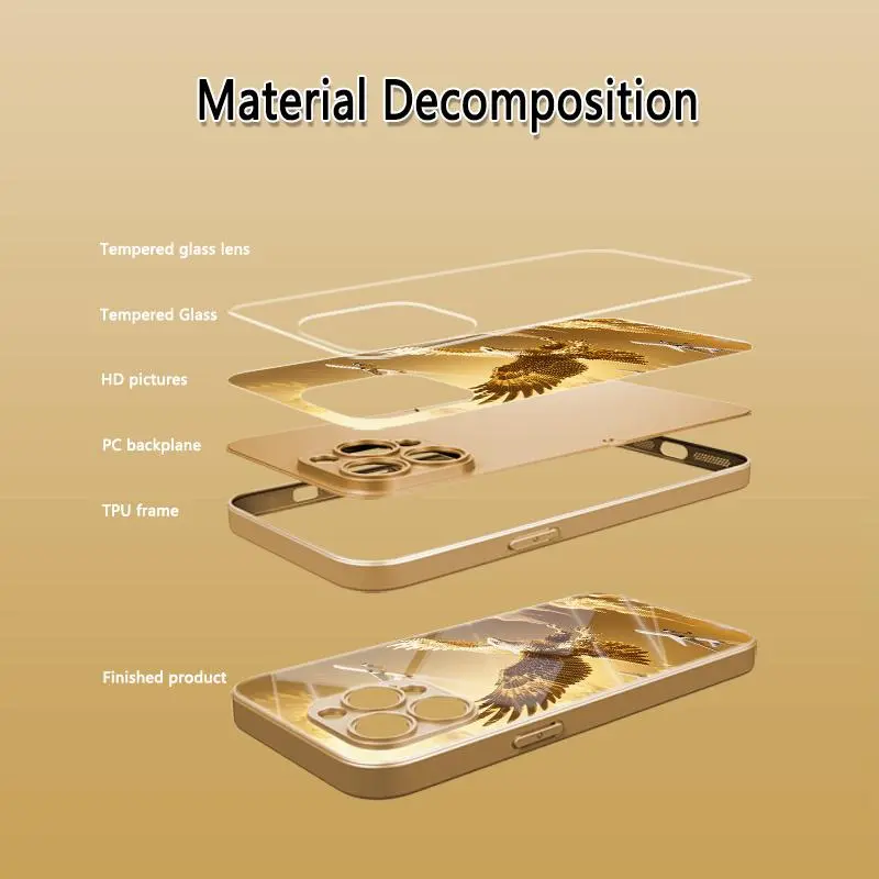 Super Cool Eagle Aircraft Gold Pattern Mobile Phone Case Suitable for iPhone 16ProMax-11ProMax, high definition glass protective case, fashionable design, durable material, shockproof protective case, technology enthusiasts, iPhone users iphone
