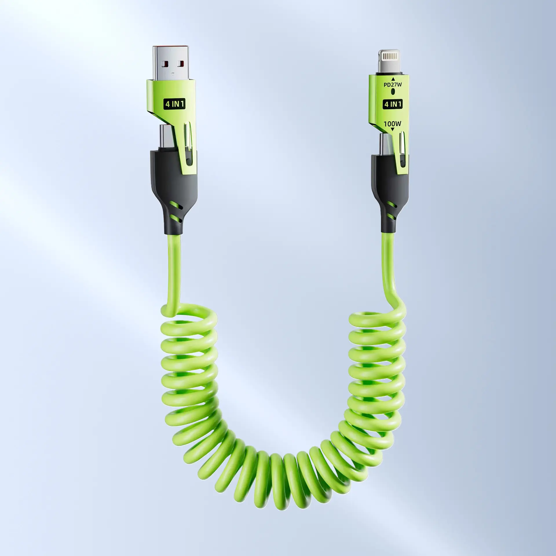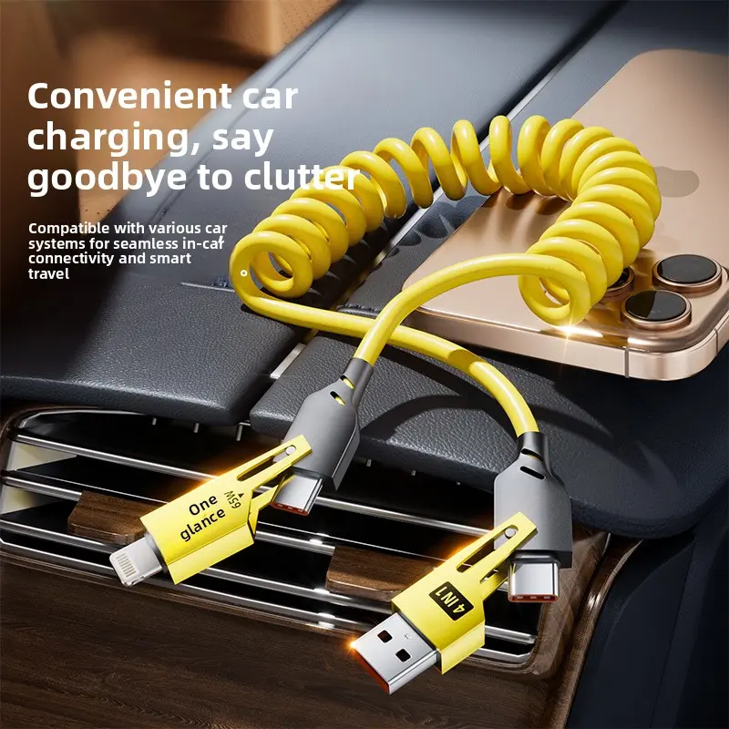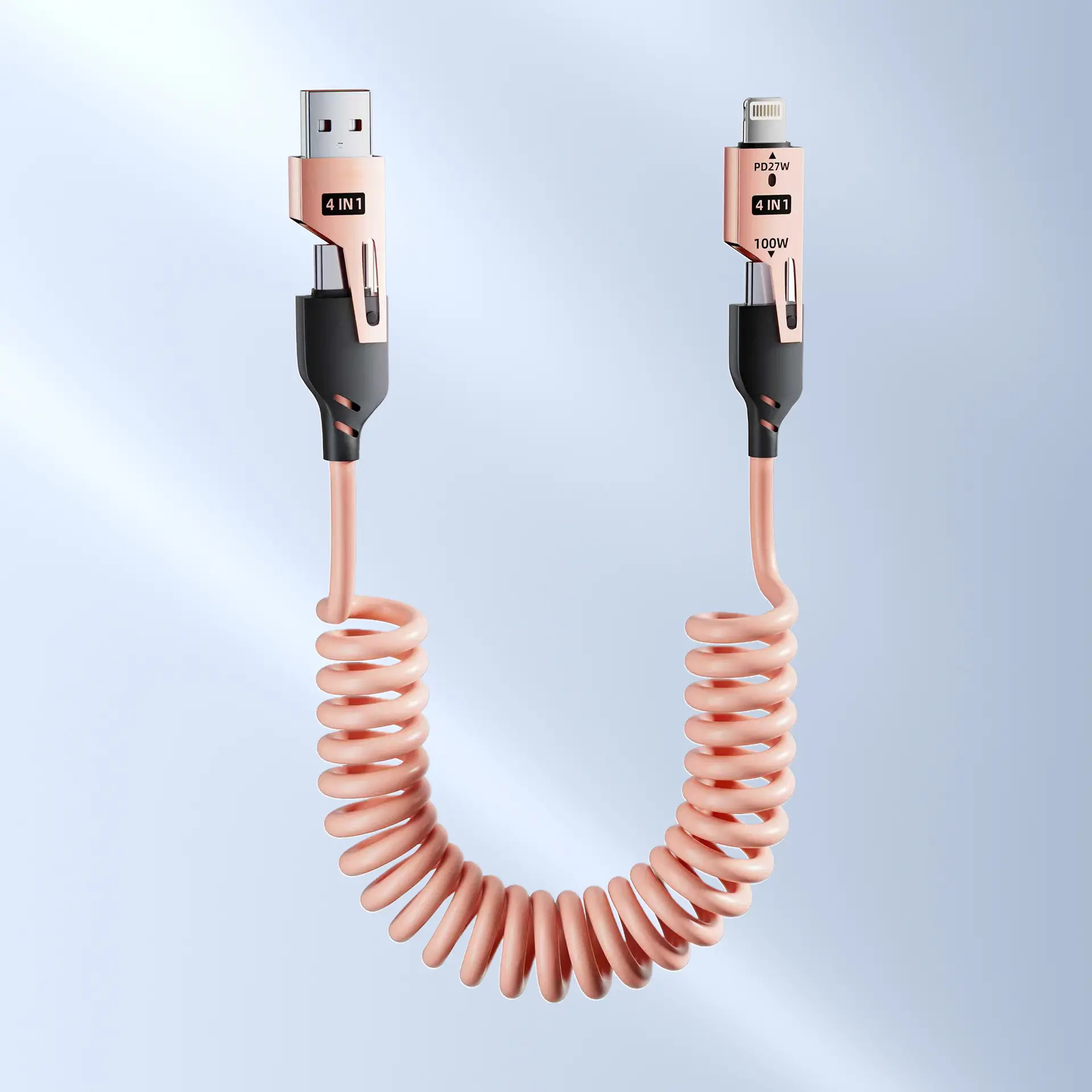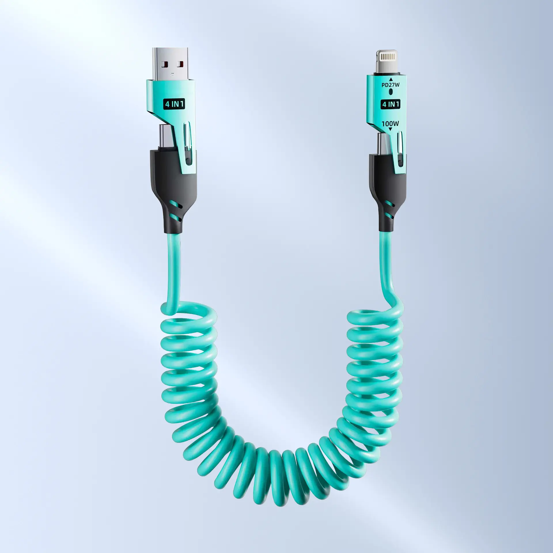 Super fast charging spring cable, 1.5m retractable 100W four-in-one data cable, car charging cable