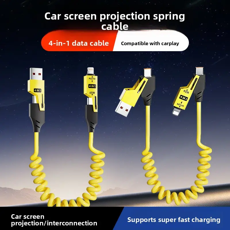 Suitable for spring data cable, retractable charging cable, 1m 1. 5m 1. 8m 2m four-in-one, dual-port, car charger, car cable, super fast charge 140W 100W, Android type-c, type-c to Lightning, Android charging cable, car charging, Android fast charging cable, fast charging, data transmission, Apple iPhone charging cable, tablet charging cable, laptop charging, Baidu CarLife/carplay, car navigation, car screen projection