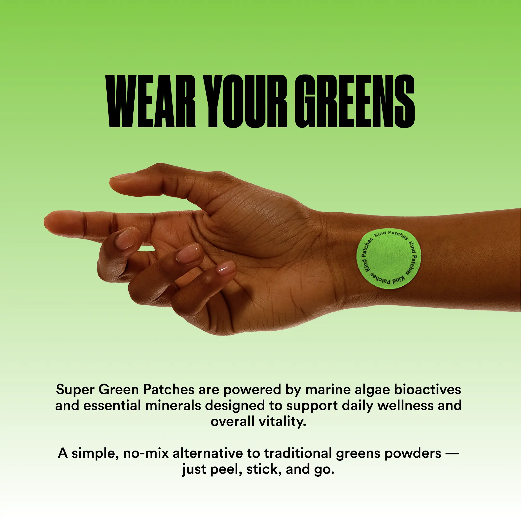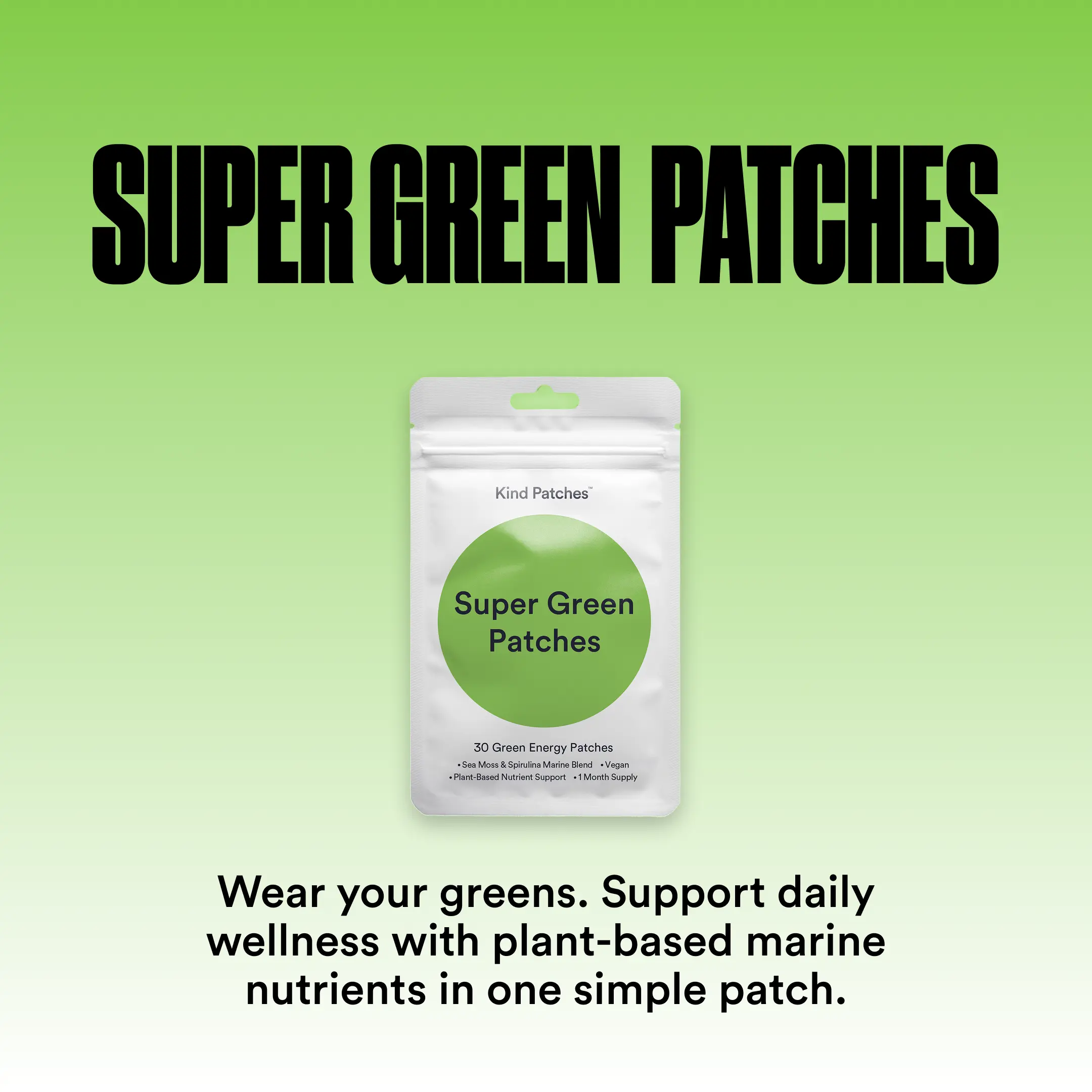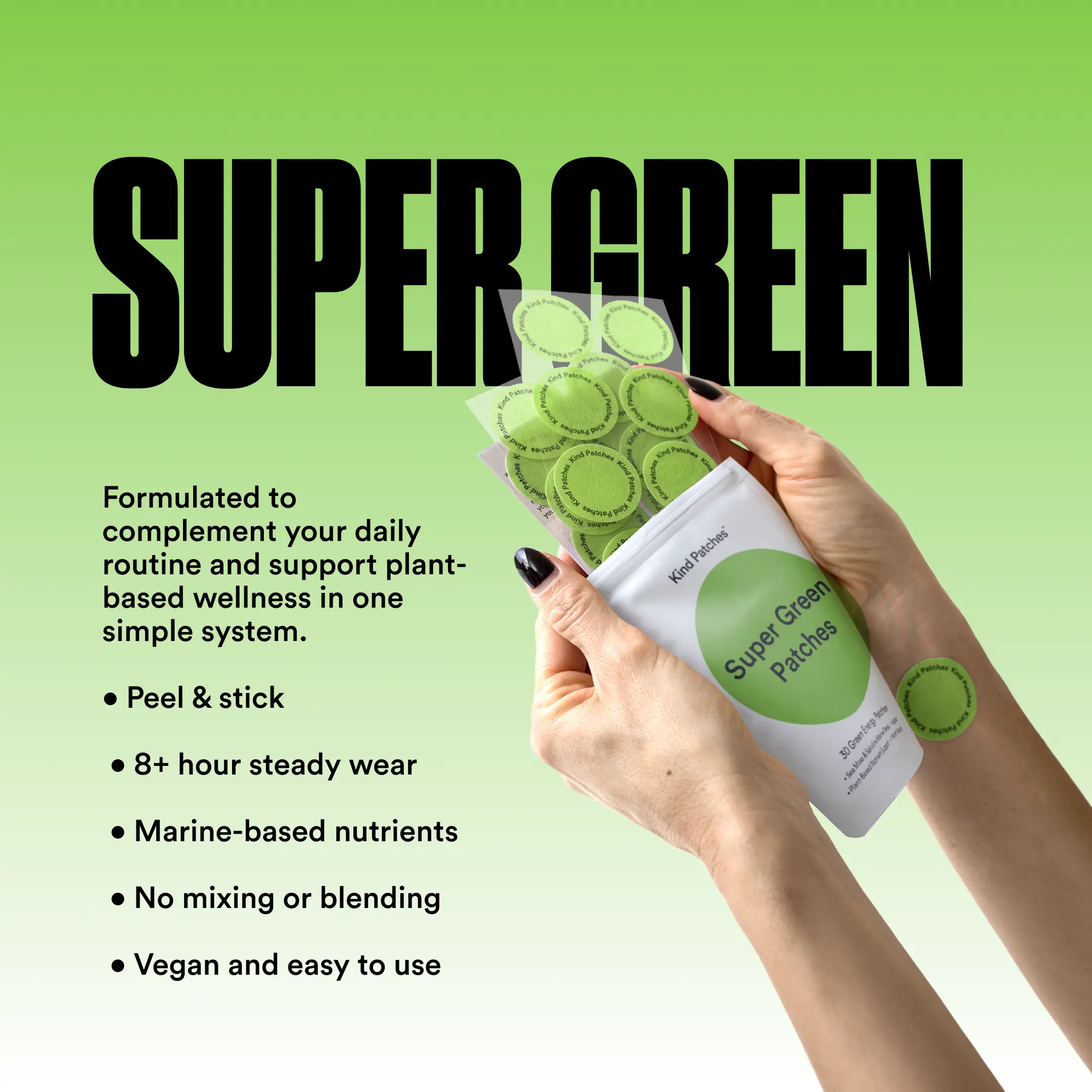 Super Green Patches is a wearable wellness patch that delivers plant-based marine nutrients steadily throughout the day. Designed to be applied as part of your morning or daily routine, these patches work to provide antioxidants supply, offer natural detox support, enable clean energy delivery, as well as maintain overall wellness, by providing essential nutrients that are often missing from a typical meals, and integrating effortlessly into your routine, without powders, drinks, or digestive discomfort.