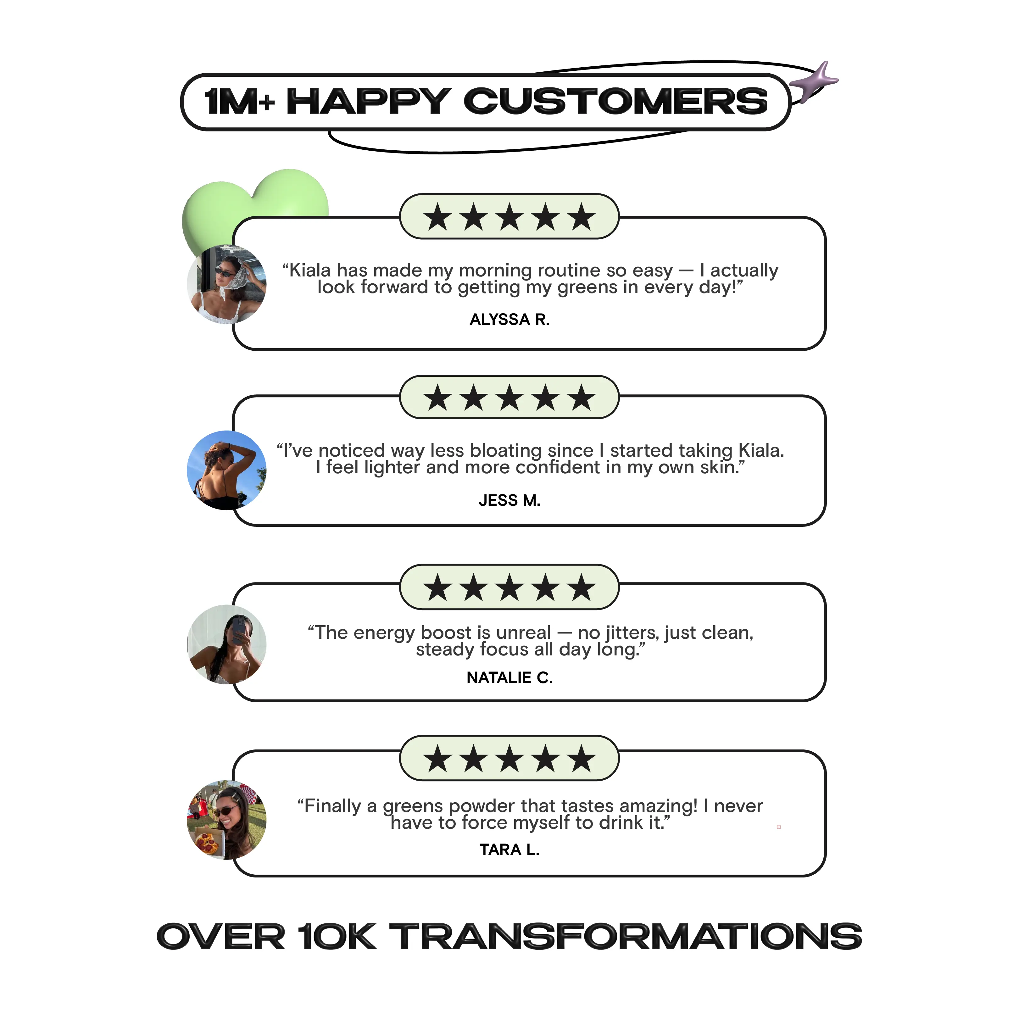 Love my Kiala Greens every morning! They have helped with my bloating significantly and actually taste good. I’ve tried other greens powders and they were all too chalky and tasted like grass, but Kiala mixes up well and tastes so fruity. Will definitely keep buying these for my morning routine!!