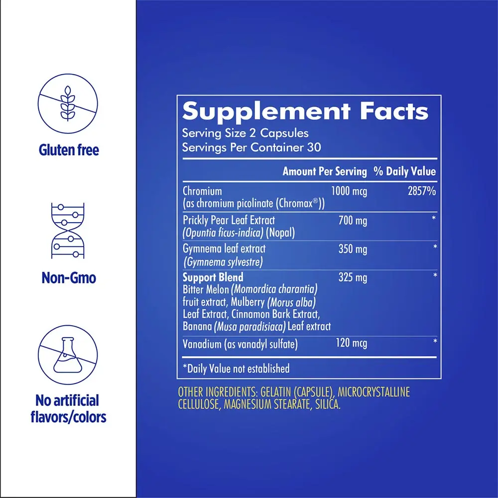 IngredientsPrickly pear (leaf) Gymnema extract (leaf) NLT 25% Gymnemic acids) Bitter Melon extract (fruit) Mulberry extract (leaf) Cinnamon extract (bark) Banaba extract (leaf) (1% Corosolic acid) Chromium Picolinate Vanadyl Sulfate Microcrystalline Cellulose Magnesium Stearate Silicon dioxide