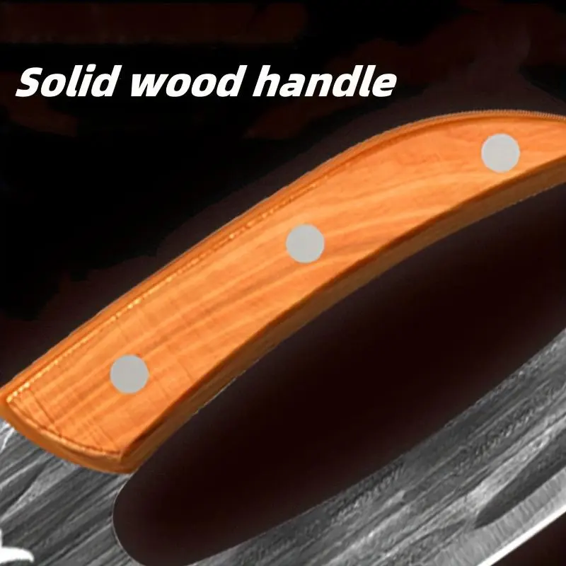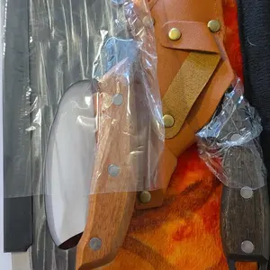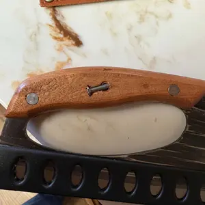 There very nice solid wood handles can’t wait to use them and the small one comes with leather cover