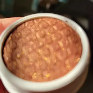 Light orange-y, red-brown base that can be built up. Sparkles are gold/peach with pops of silver and purple. Almost a darker, more orange, more sparkly ver of Amaze.