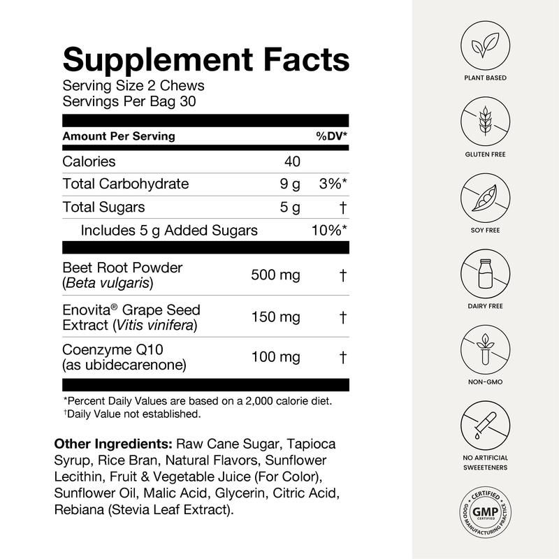 Here’s the nutritional value for SuperBeets Heart Chews Advanced with CoQ10 (per 2 chews serving):