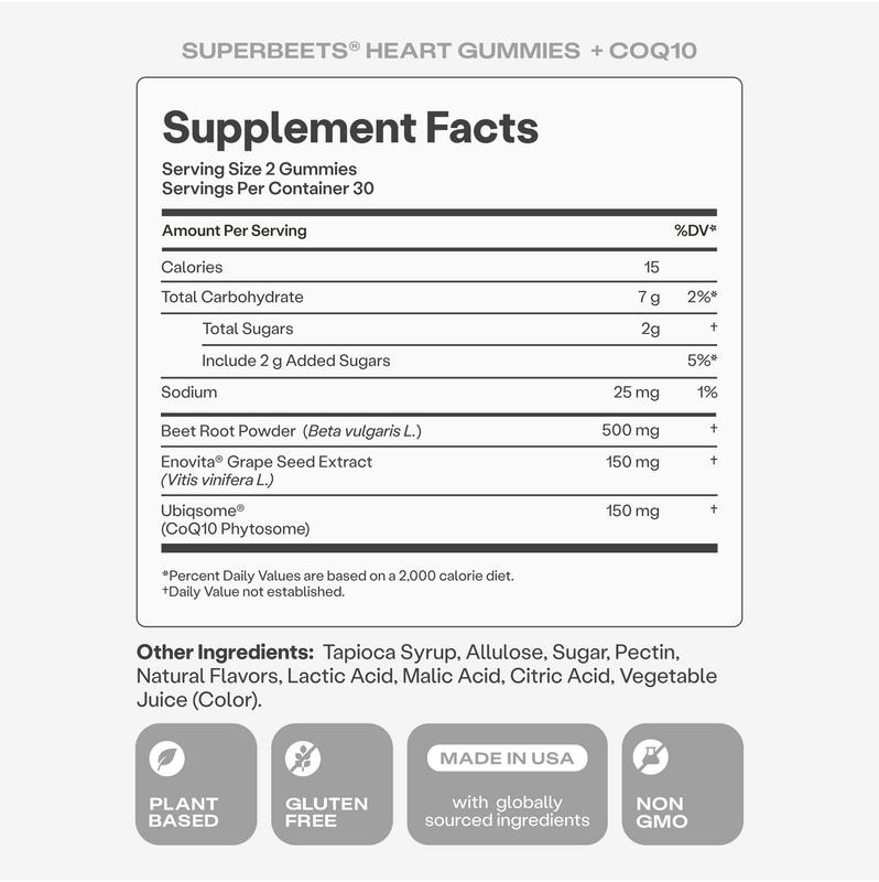 SuperBeets is the #1 doctor, pharmacist, cardiologist recommended beet brand for heart health support. Just two plant-based SuperBeets Heart Gummies Advanced a day is an easy way to help support healthy blood pressure, heart healthy energy, nitric oxide production, essential CoQ10 levels, and overall heart health.