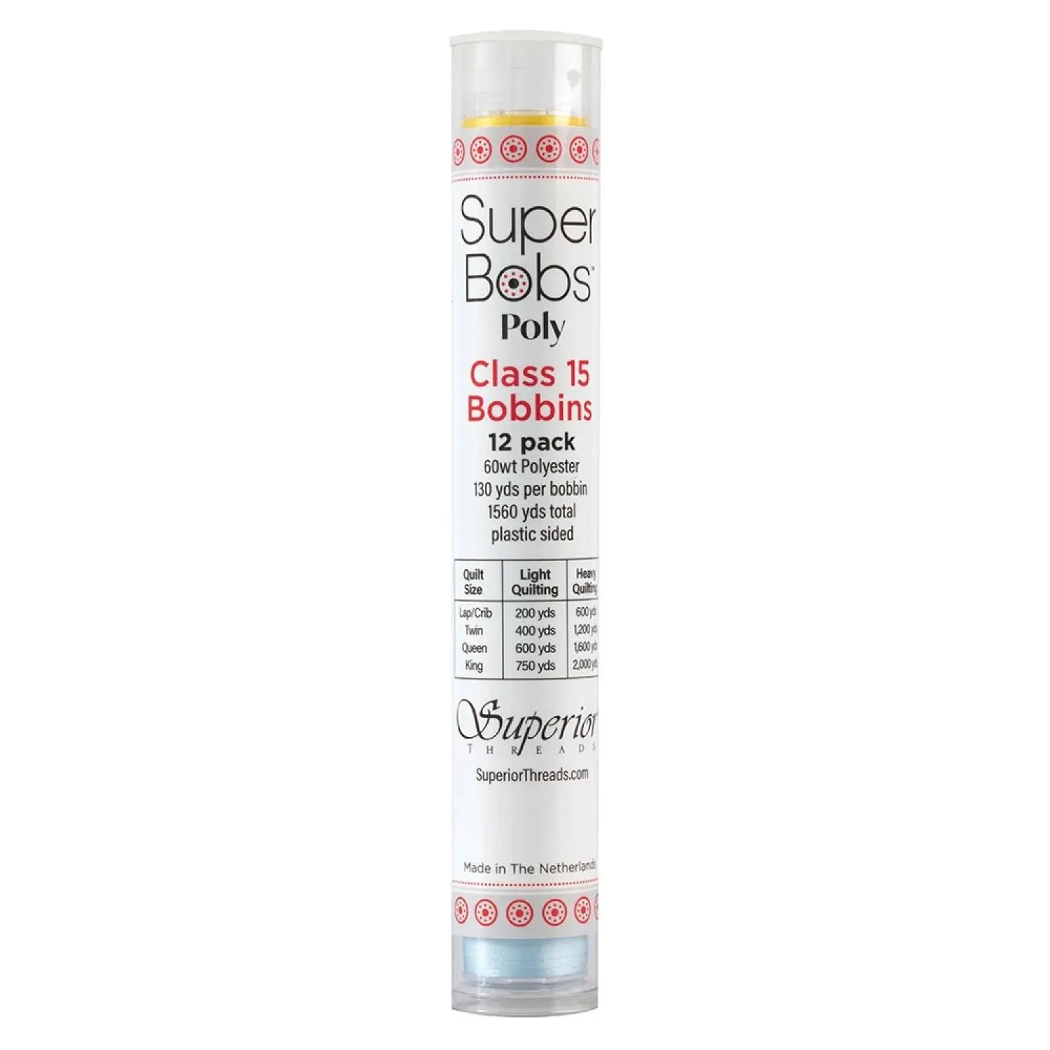 Tube of 12 cardboard sided bobbins. Designed for applique, bobbin thread, embroidery, and quilting. Class 15 Bobbins