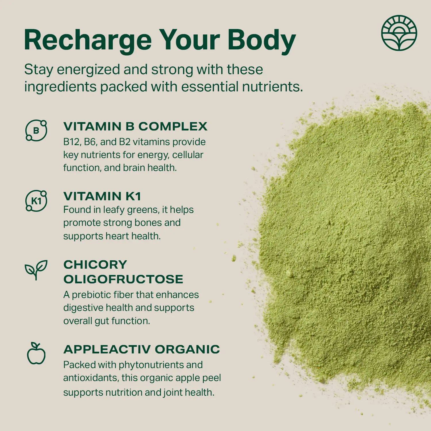 IngredientsVitamin B Complex B12 + B6 + B2 vitamins, essential for a healthy lifestyle, provide essential nutrients needed for energy, cellular function support, and brain health Vitamin K1 Naturally found in leafy greens, it is known to help promote healthy bones and maintain heart health Chicory Oligofructose A prebiotic dietary fiber that promotes gut health and supports digestive function AppleActiv Organic Naturally rich in phytonutrients and high in antioxidant content, this organic apple peel pro