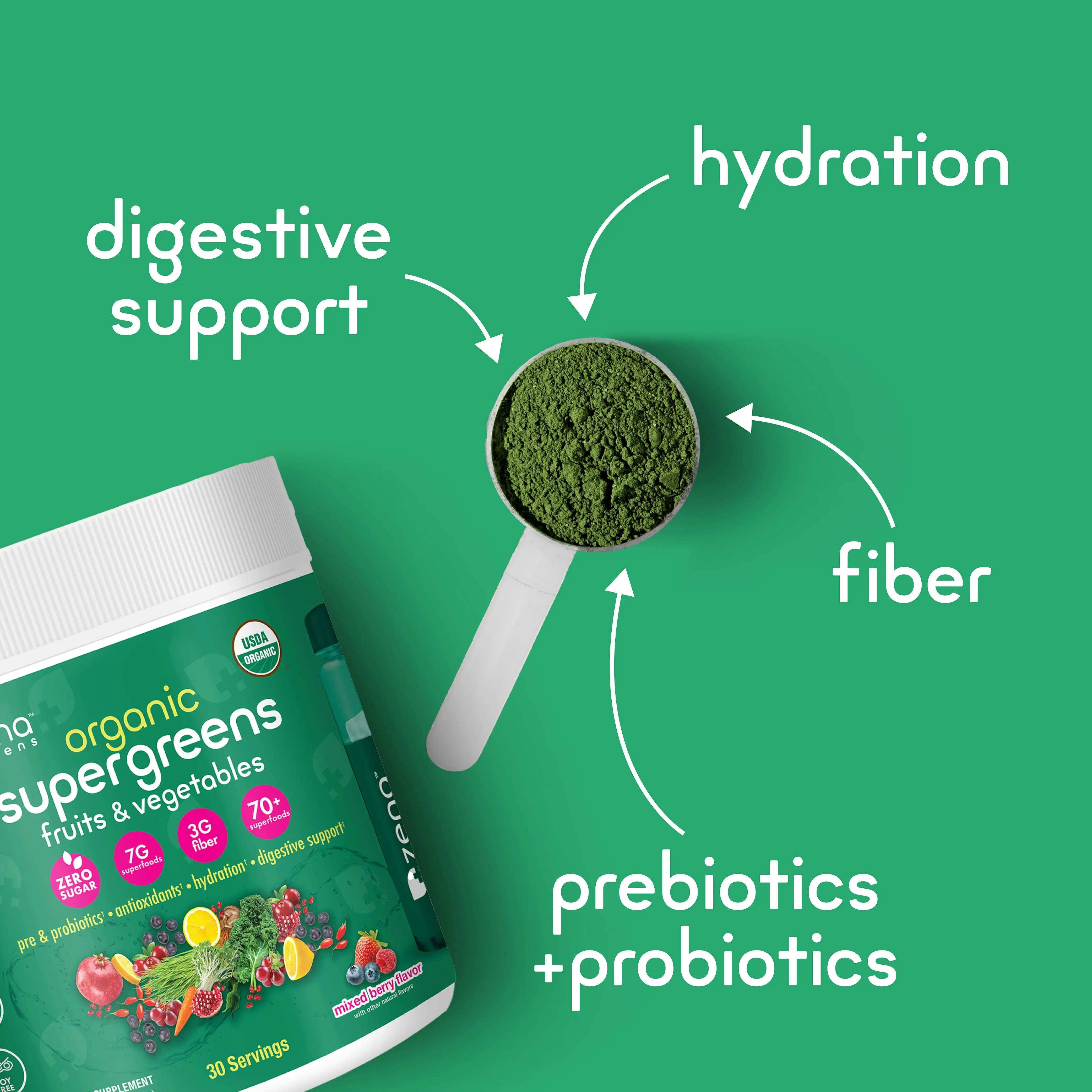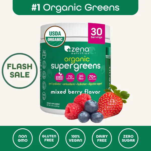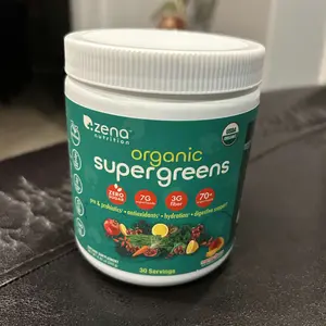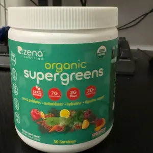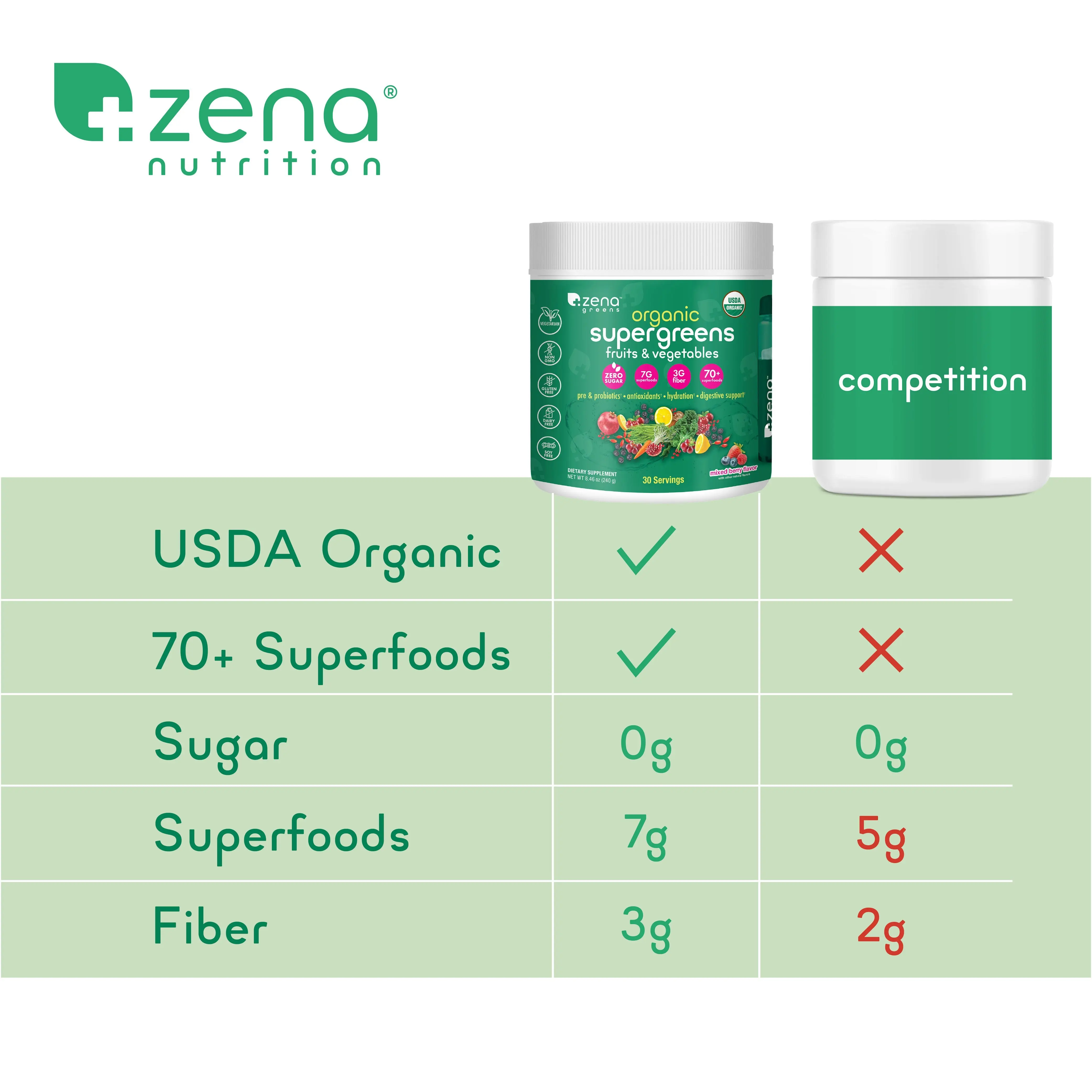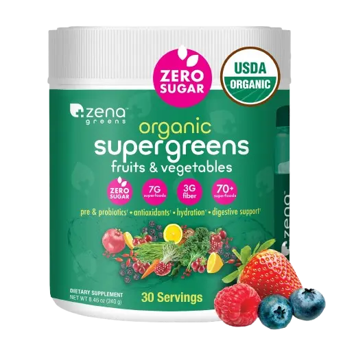 Zena Nutrition Organic Supergreens Powder is USDA Certified Organic, ensuring purity and quality. It's zero sugar, naturally sweetened, and rich in antioxidants, fiber, probiotics, and digestive enzymes. Supports gut health and overall wellness. No artificial flavors or preservatives; monk fruit adds a refreshing taste. Enjoy the easiest way to get your daily fruit and vegetable intake!