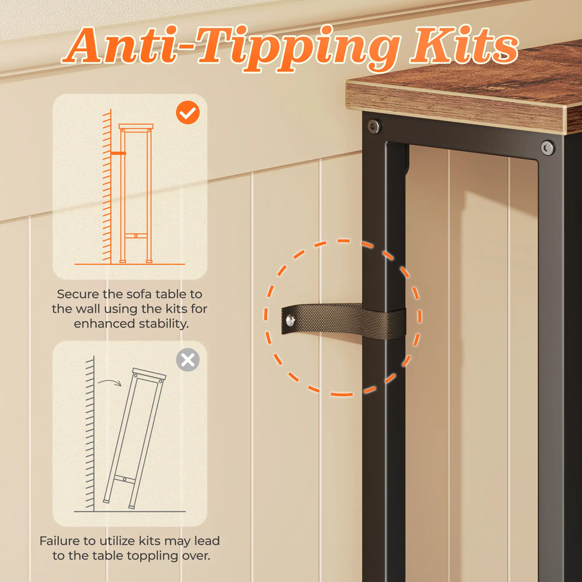 ·【Strong, Stable & Safe】Made from high-quality engineered wood and a sturdy metal frame, this behind the sofa table is built for daily use. Anti-tip kit included for wall-mount safety, plus upgraded larger adjustable feet keep it steady on uneven floors, much more stable than smaller leg bases