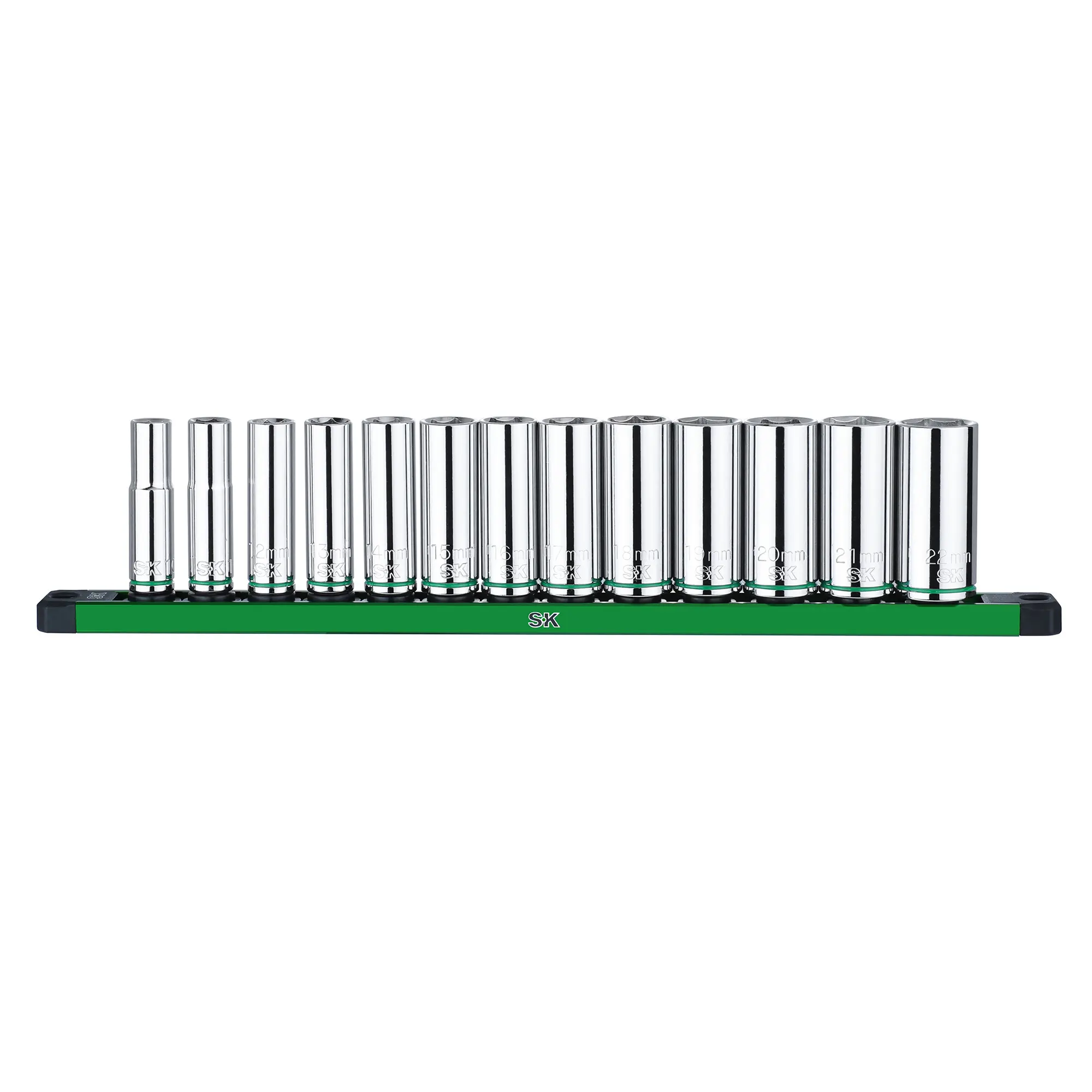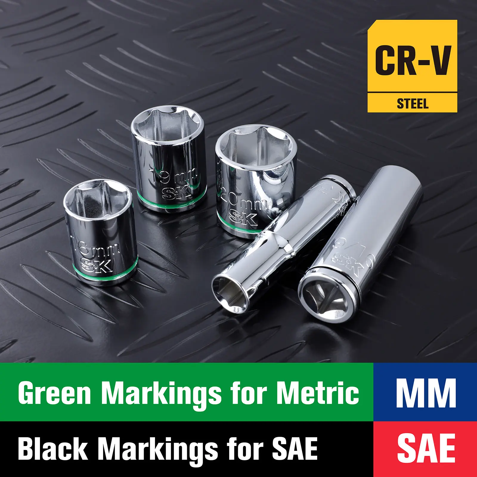 ·The most common deep socket sizes include: 10, 11, 12, 13, 14, 15, 16, 17, 18, 19, 20, 21 and 22 mm, with visible size markings and color-coded rings - Black for SAE and Green for METRIC - for easy identification