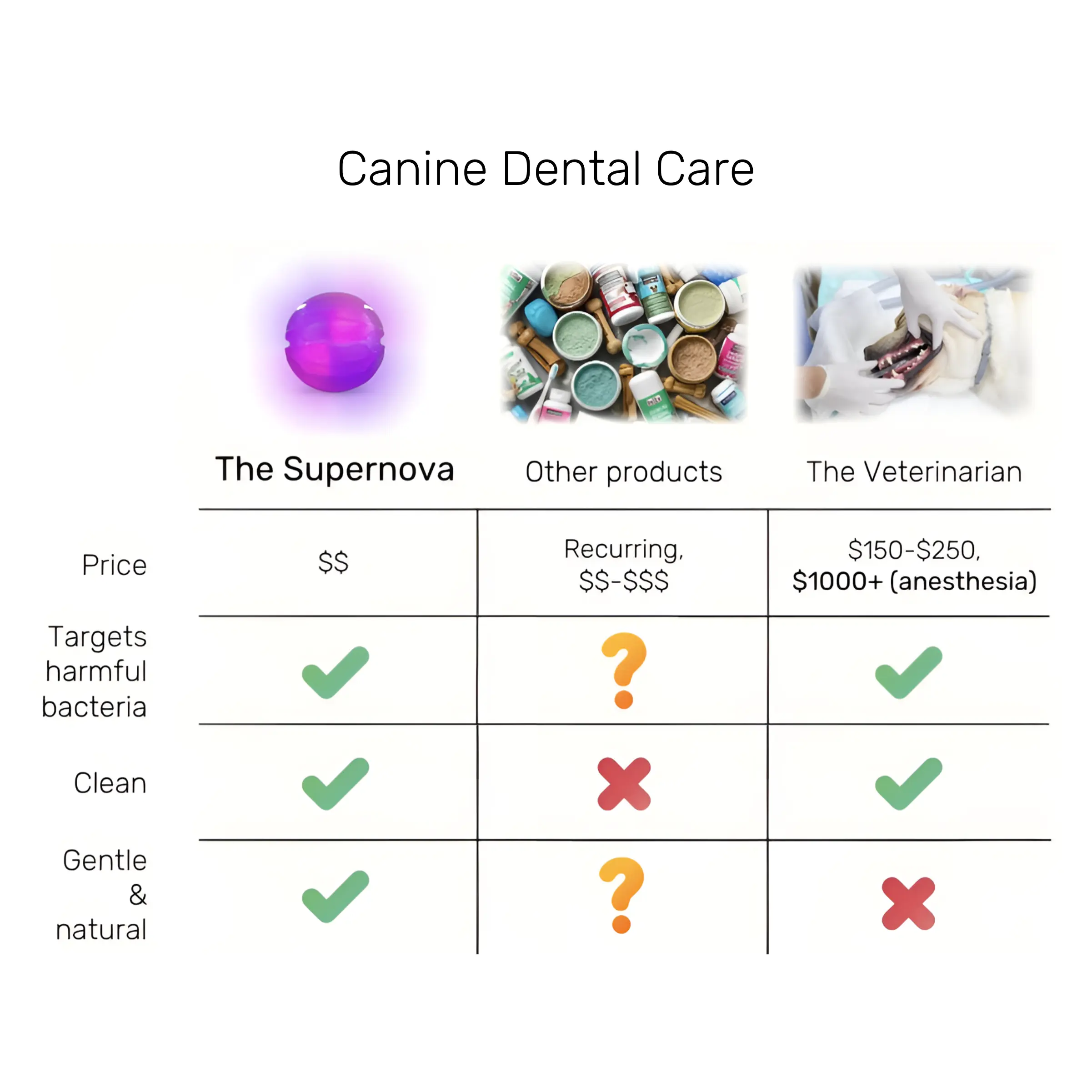 Say goodbye to stinky breath, stressful brushing, and expensive vet cleanings. The SUPERNOVA Starter Bundle is your all-in-one oral health solution—powered by NASA & Harvard study-backed light technology and irresistible natural flavor.