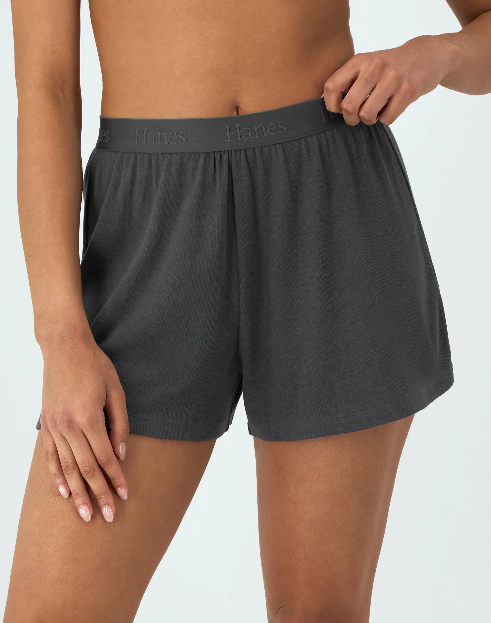 ELEVATE YOUR EVERYDAY BASICS Luxuriously lightweight and indescribably soft, these Super Soft Comfywear Sleep Shorts from Hanes Originals feel great against your skin - making them the perfect versatile style for sleeping or lounging. Our softest fabric EVER, these women's sleep shorts are made with luxe viscose from bamboo blended with cotton and spandex for a flexible fit. Detailed with a luxe, tonal soft-stretch waistband, these women’s sleep shorts offer ribbed fabrication for easy movement. A Tagless® interior eliminates itching and irritation caused by tags. A cozy closet staple, these sleep shorts for women pair perfectly with our coordinating ribbed tank for a look that’s all your own. Hanes Originals. Who says you can’t have style and comfort? (Not us).? BE YOURSELF IN HANES ORIGINALS - Stylish and modern essentials now with SuperSoft fabric that feels as good as it looks.