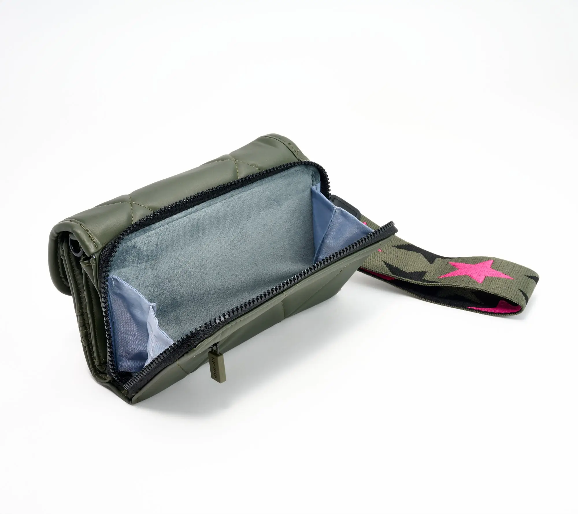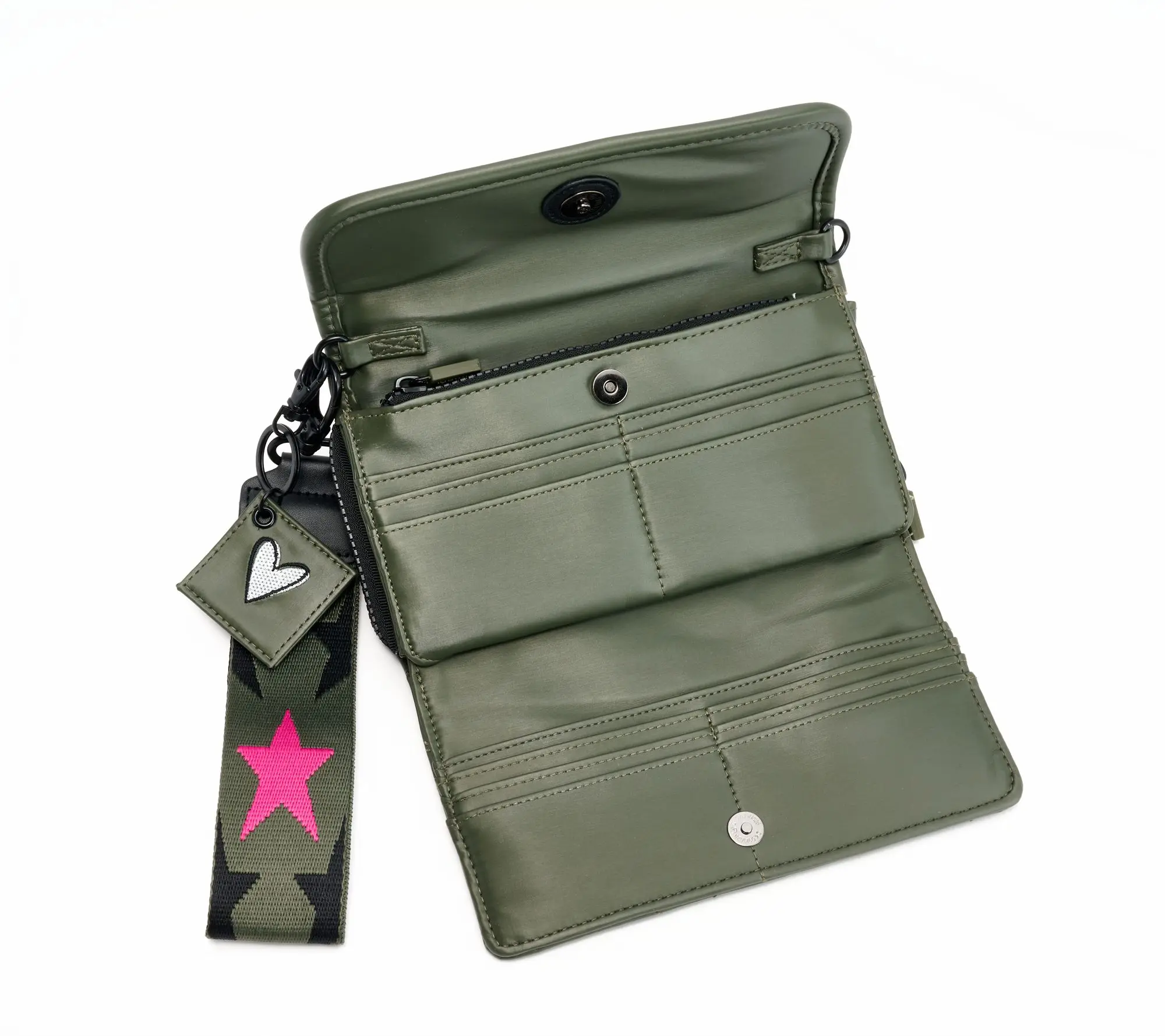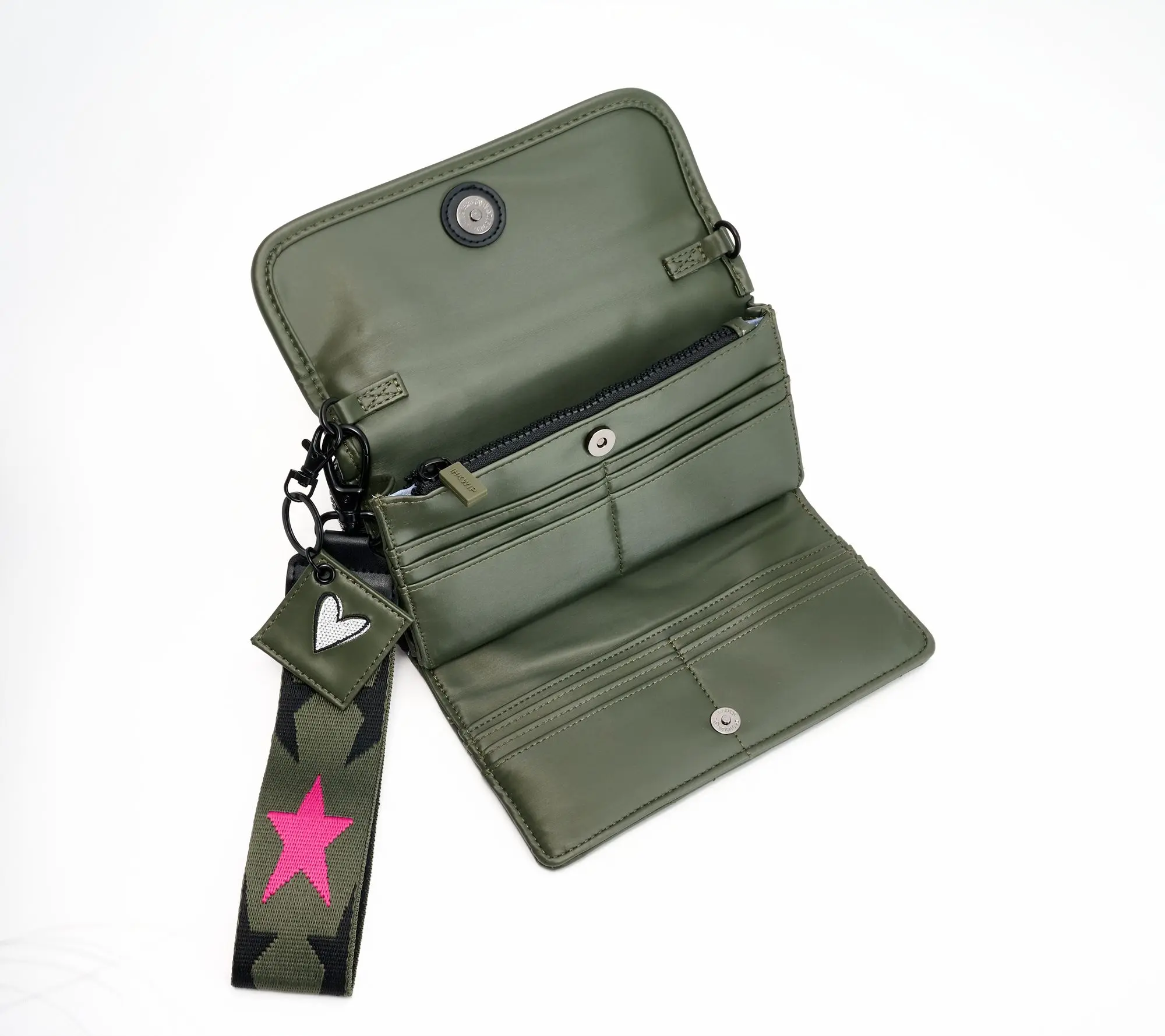 Shawn Killinger x IHKWIP Superstar Wallet Crossbody,includes a built in RFID wallet with card slots & cash sleeve.Crossbody strap & star wristlet strap,removable & adjustable.Gusseted soft-lined________ cellphone & glasses pocket.Interior:gusseted pocket,zip pocket. Exterior:rear zip pocket.Includes removable heart embroidered keychain Dimensions:Bag-8.5"L X 2.5"W x 5.0"H,Crossbody Strap-28"-56"Weight: 13.5oz,Conent:Exterior:70%Polyurethane,30%Polyester or 100 % polyester , lining-100 % Recycled Polyester.COO:Imported