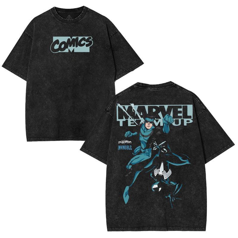 5. Superstyle MTU Spidey vs Mark Grayson Invincible War Comic Double Printed Oversize Lightweight Acid Washed Tee TV Series Graphic Cotton T-Shirt Fabric Menswear