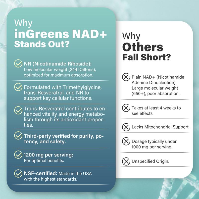 ·Premium Anti-Aging:inGreens NAD⁺ 1800 embodies decades of cellular health research, offering a scientifically-driven premium anti-aging solution. Trusted globally by health enthusiasts, we uphold uncompromising quality standards to restore youthful vitality from within.