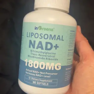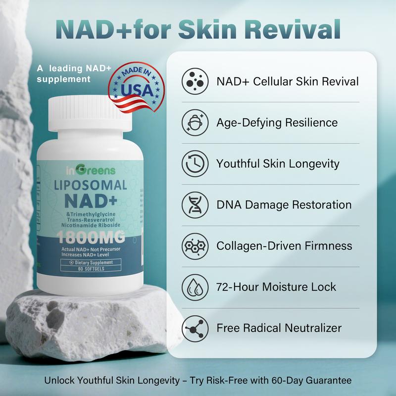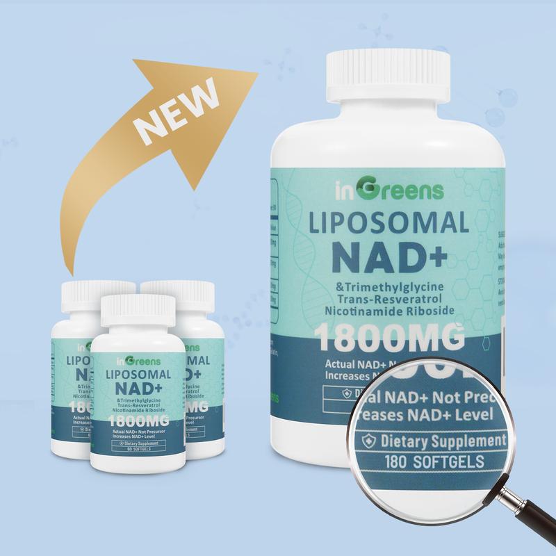 ·Scientific NAD⁺ Supplementation Formula: inGreens NAD⁺ 1800 delivers 1200 mg of liposomal NAD⁺ synergized with 200 mg trimethylglycine, 200 mg trans-resveratrol, and 200 mg nicotinamide riboside (NR). This advanced formulation is designed to directly replenish intracellular NAD⁺ levels, activate longevity-associated pathways such as SIRT1, and target oxidative stress, DNA repair, and mitochondrial energy production. Leveraging cutting-edge liposomal technology for rapid absorption, it promotes anti-aging benefits for skin, hair, and nails while enhancing systemic vitality.