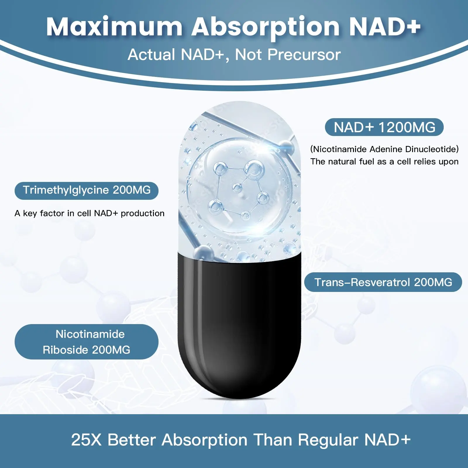 ·Synergistic Formula: NAD+ supplement also includes Trimethylglycine and Trans Resveratrol, two powerful antioxidants that work together with NAD plus to provide comprehensive health and wellness benefits. Liposomal nad+ formula is designed for superior absorption and effectiveness.
