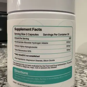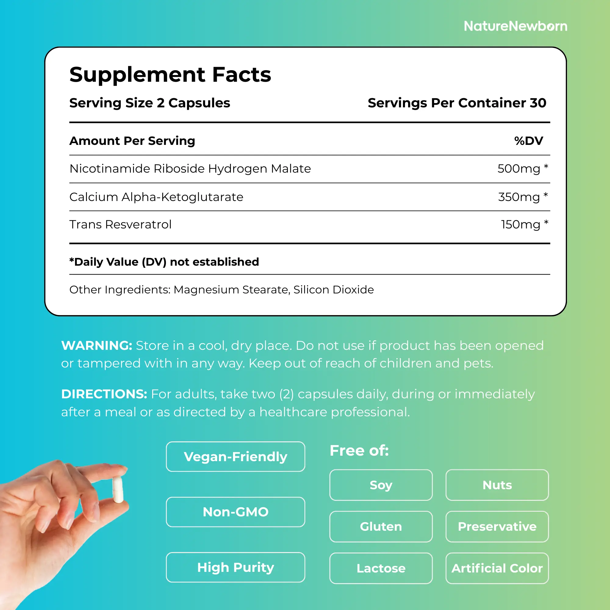 Nicotinamide Riboside Hydrogen Malate 500 mg, Calcium Alpha Ketoglutarate 350 mg, Trans-Resveratrol 150 mg