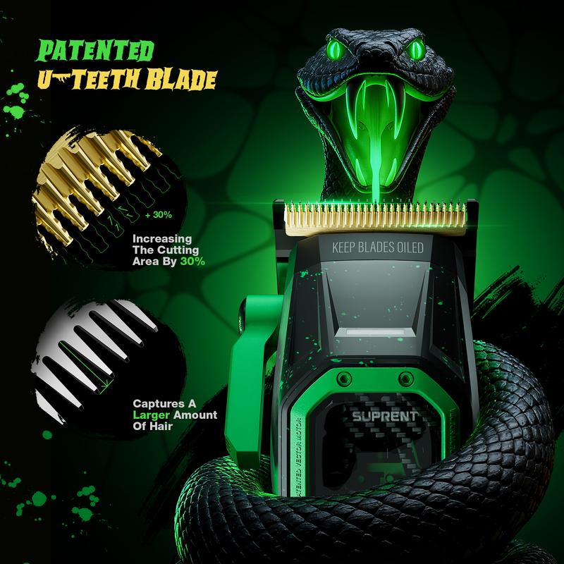 Driven with it's beast-like serration teeth with a unique U-shape to mimic a predator's grip, FANGS blade captures a wider area of hair than traditional V-shaped teeth. This design dramatically boosts cutting efficiency by increasing the effective cutting area by 30%. Furthermore, the blade features a durable DLC coating for an ultra-smooth glide and unmatched longevity.
