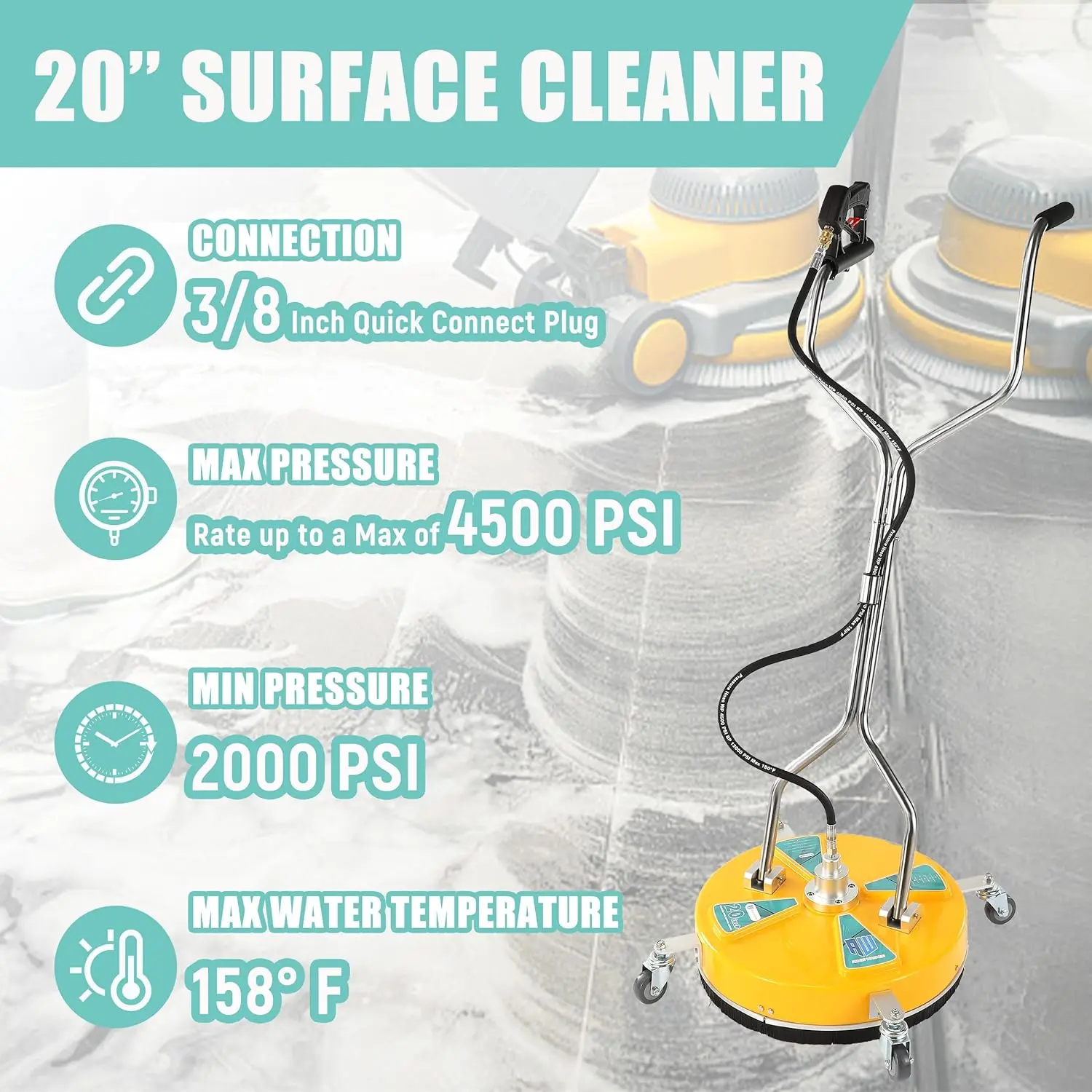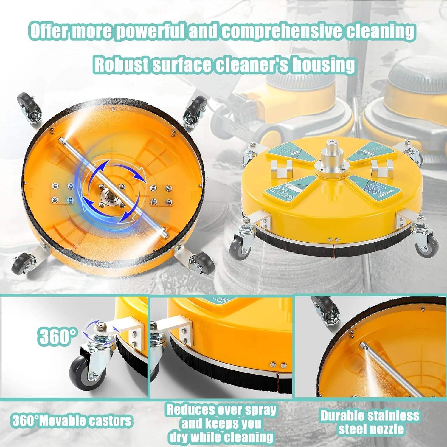 ·EXPERIENCE HIGH-EFFICIENCY CLEANING with our 20 inch surface cleaner for pressure washer! Compared to driveway pressure washer attachment, this pressure washer surface cleaner attachment allows you to clean larger areas more effectively, significantly reducing cleaning time when compared to using a turbo nozzle. Save valuable time while still getting excellent cleaning results!