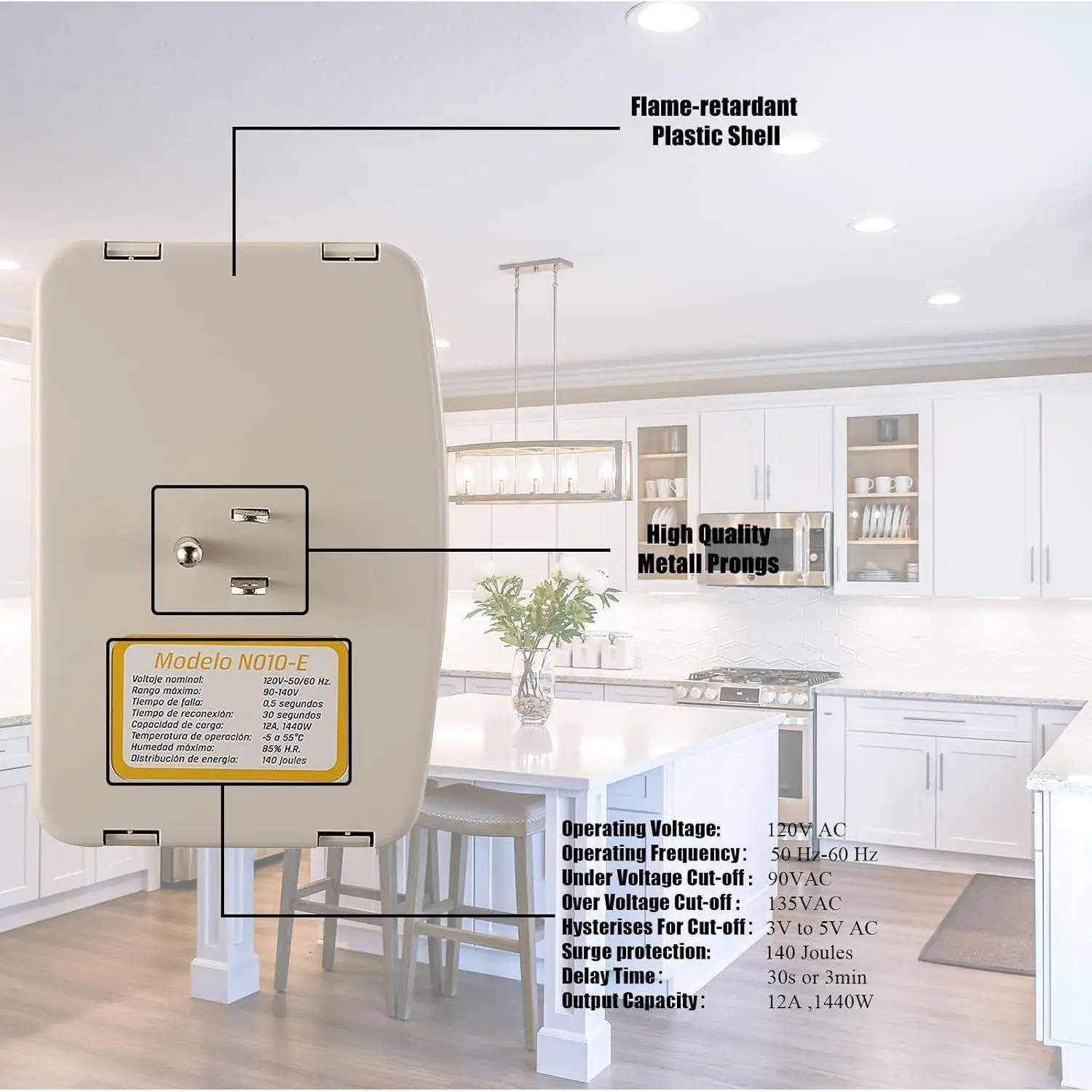 【】: Light indicators for Normal(Output), High(SOBRE VOLTAJE), Low(BAJD VOLTAJE), and Delay(CICLO DE ESPERA) (💖The printed text and instructions of this surge protector are in Spanish. If you have any questions, please do not hesitate to contact immediately)