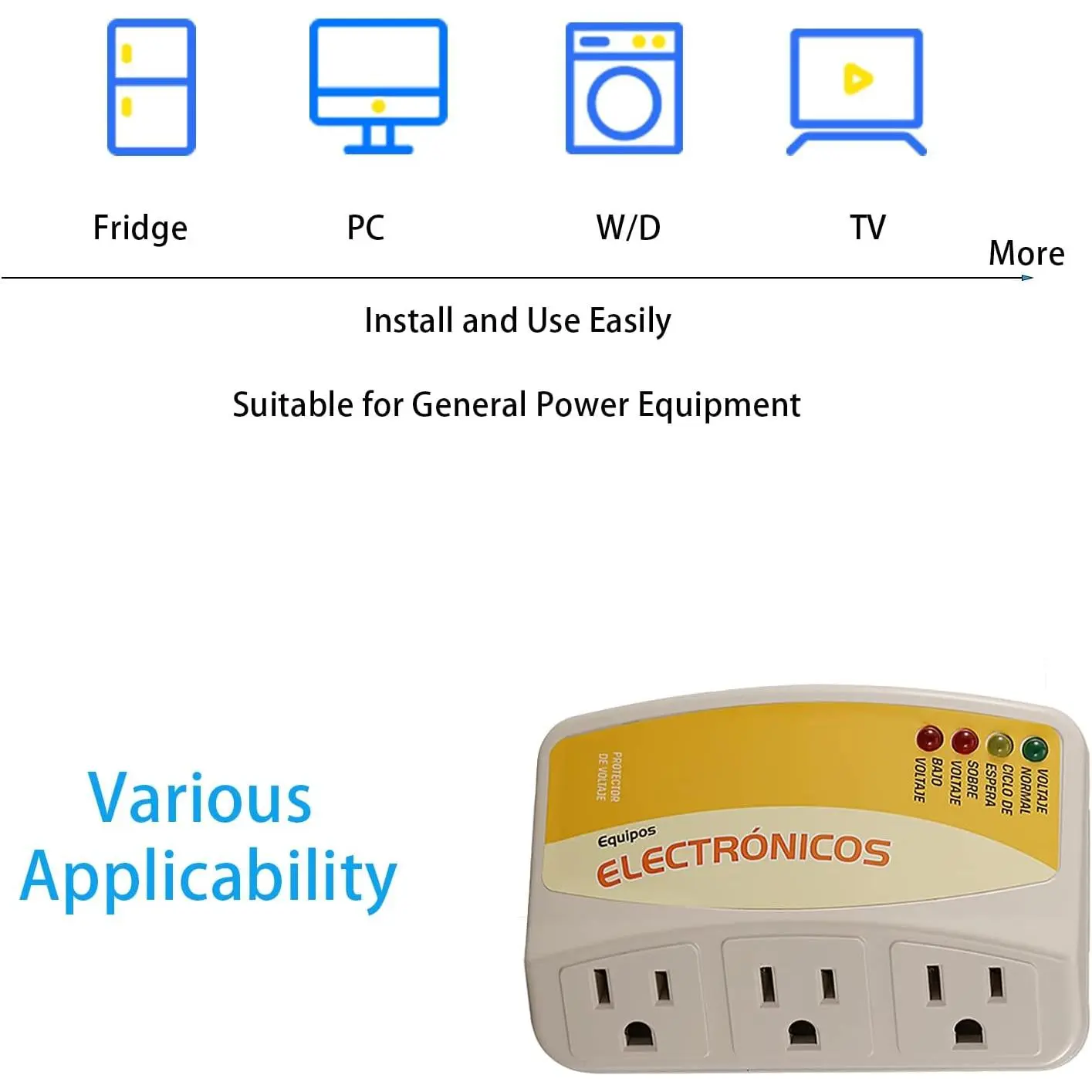 【Applicable Equipment】: The (surge) protector is suitable for Air Conditioners, Refrigerators, Ice Makers, Washing Machines, and other Electrical Appliances.