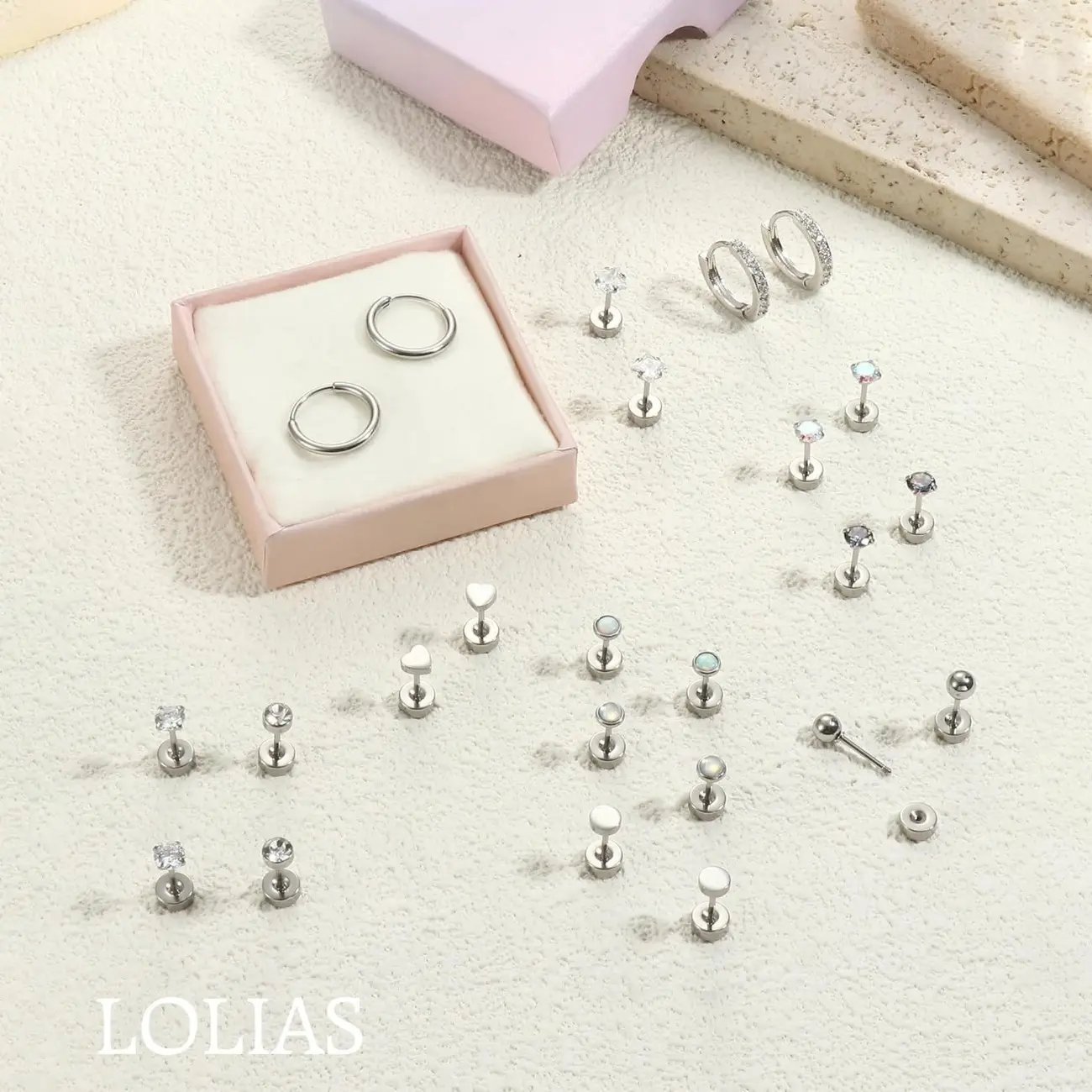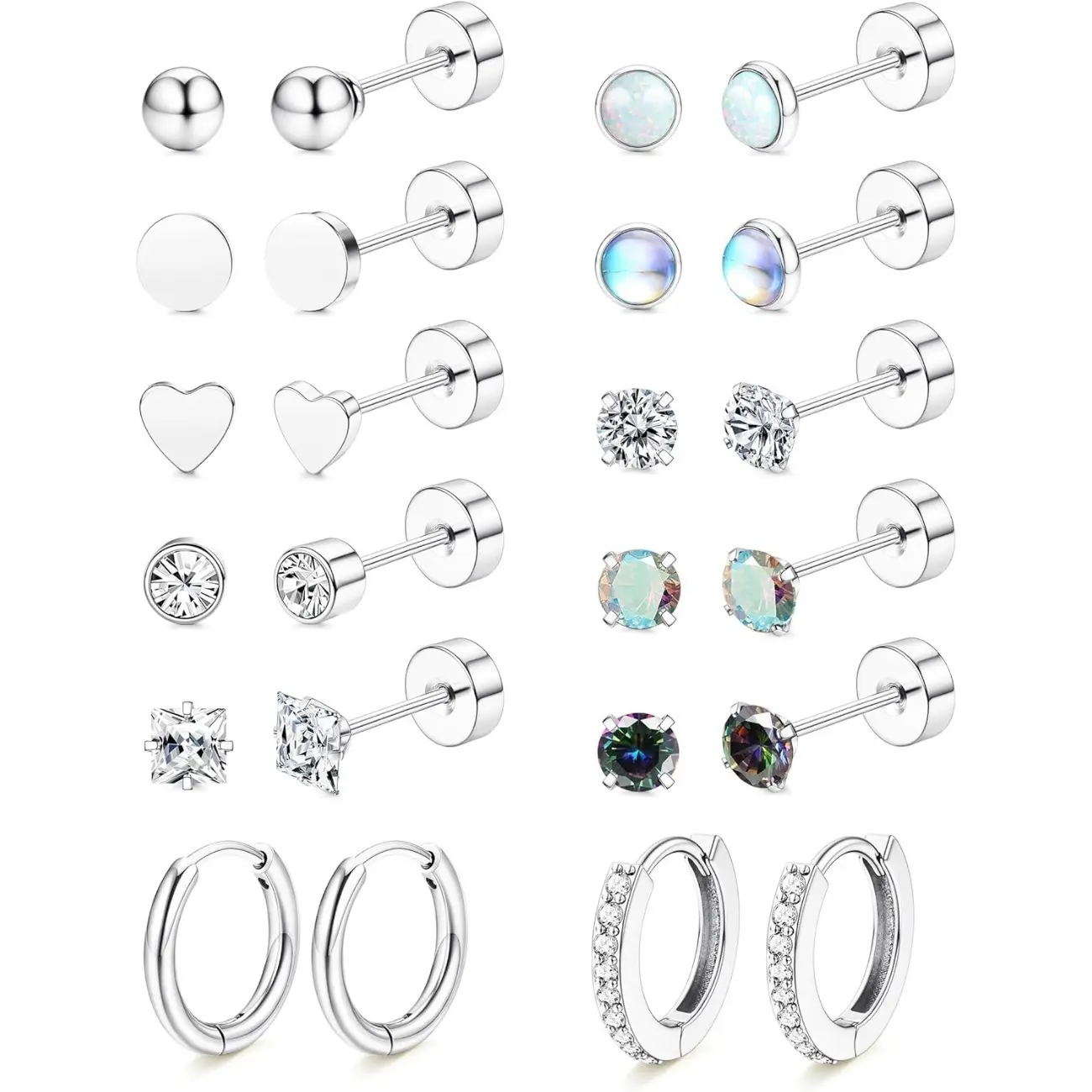 ·Earring Sets for Multiple Piercing--10 Pairs flat back studs and 2 Pairs surgical steel hoop earrings in one order.Including opal flat back stud earrings,moonstone flatback earrings,CZ surgical steel earrings hypoallergenic,star small post earrings for women men,heart screw back earrings and classic ball stud earrings for women men.CZ small hoop earrings.Fashion and timeless earrings set,It offers multiple ways to be styled and worn