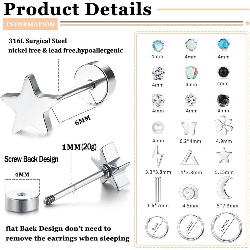 ·Hypoallergenic: FIBO STEEL 21 Pairs Surgical Steel Flat Back Earrings are hypoallergenic.